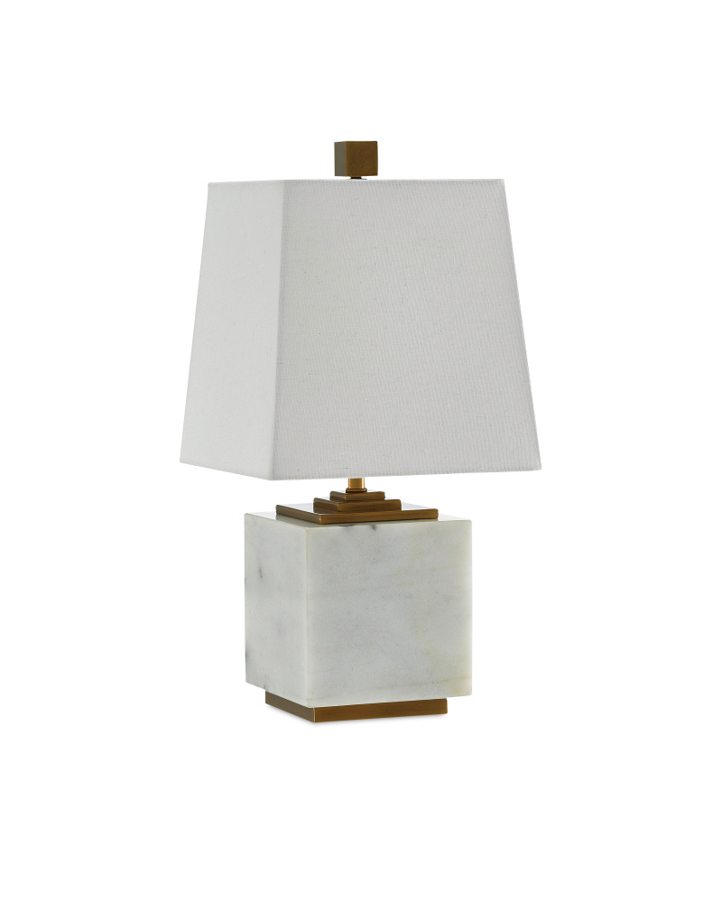The Annelore Table Lamp is made from a block of white marble with stacked plates of metal above its body and a single-slab base below it. Along with the tall metal finial in an antique brass finish, these elements contrast the marble and the white linen shade. for a black version of this lamp, see our Mairin Table Lamp.