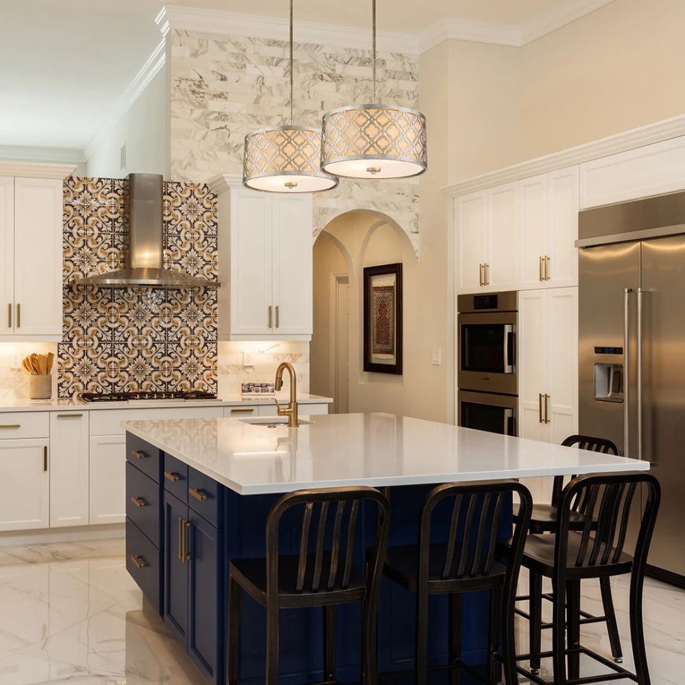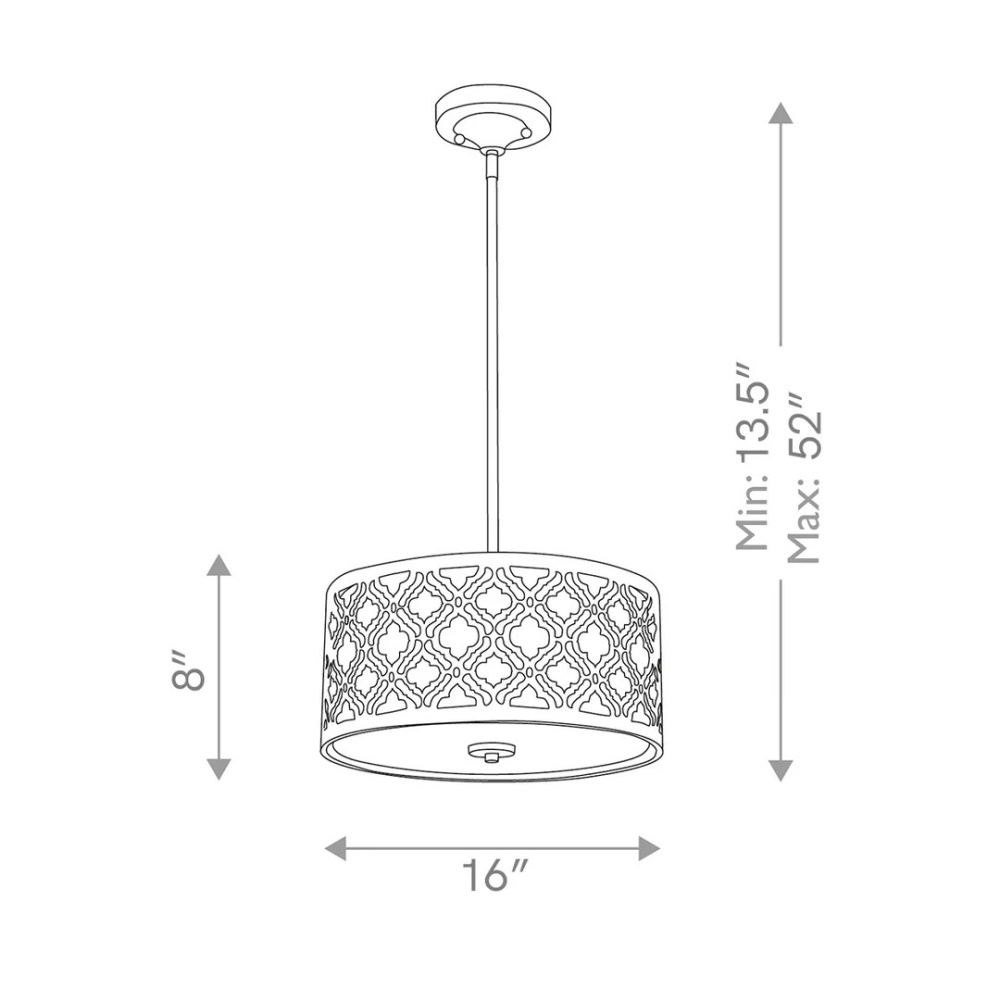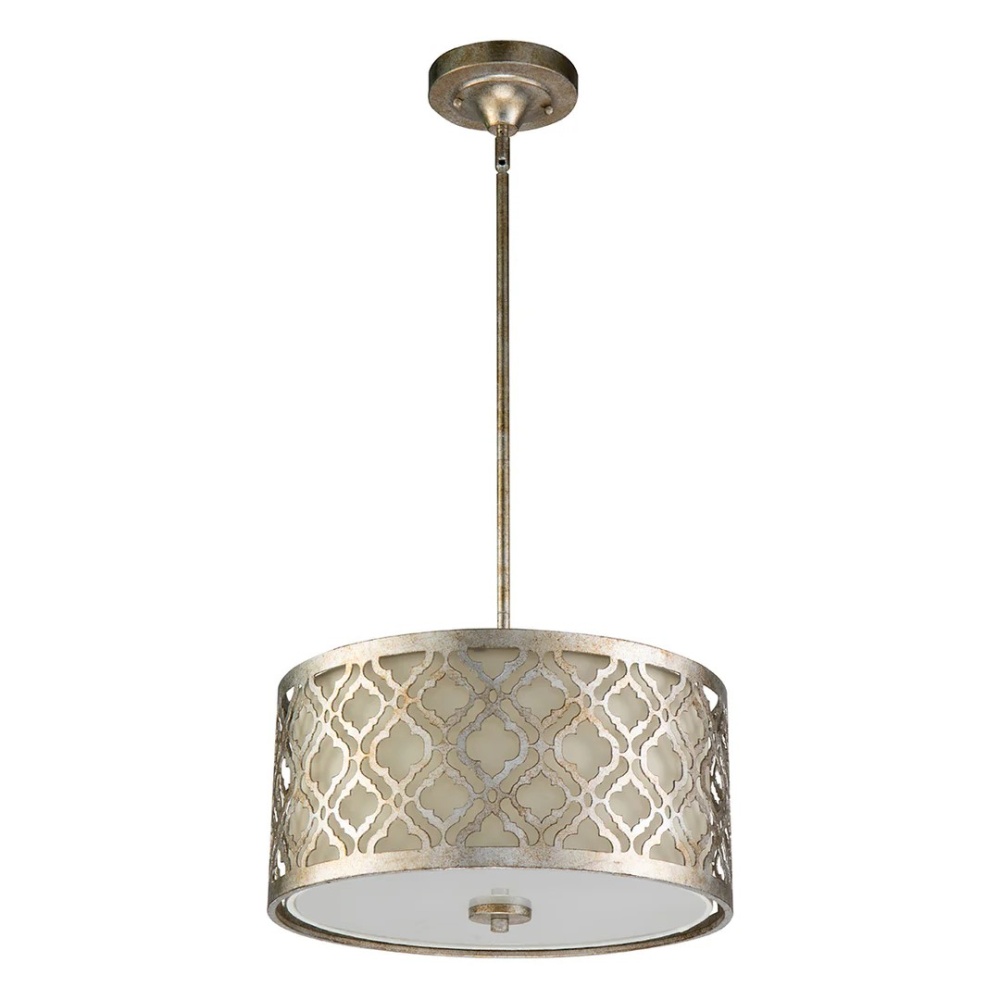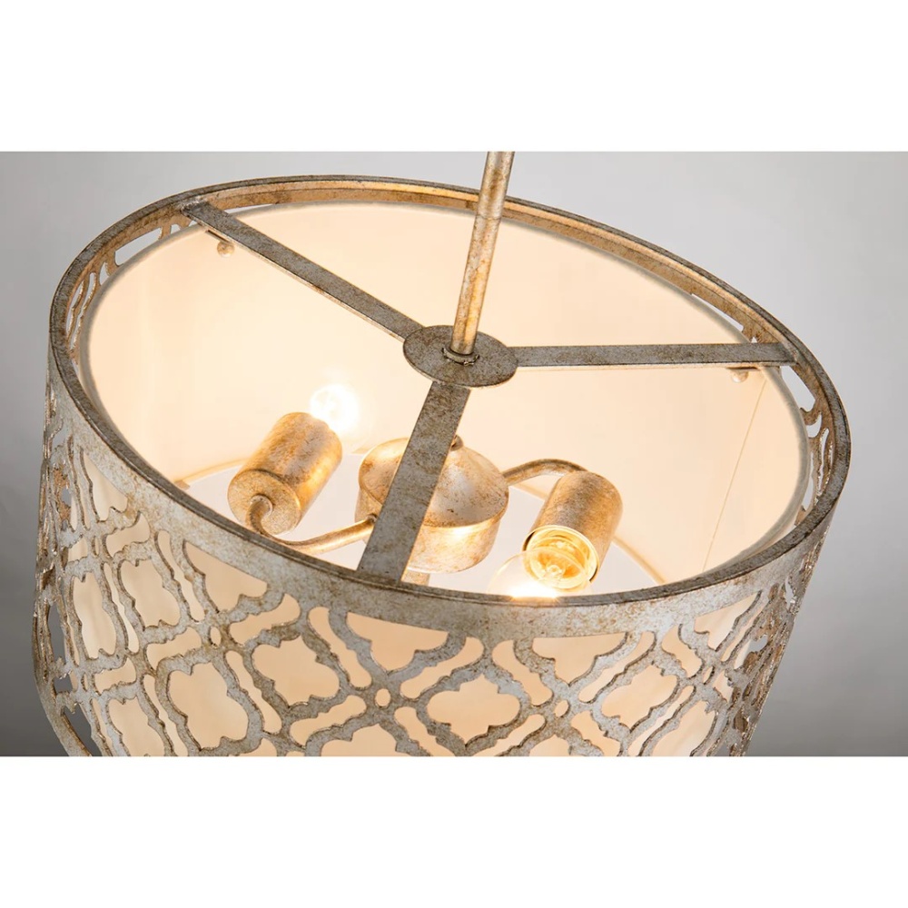 A vintage 52" adjustable pendant in distressed silver. Its trellis shade, cream linen inner, and diffuser soften light, convertible to semi-flush. Ideal for tables or hallways, it elevates any space with style.