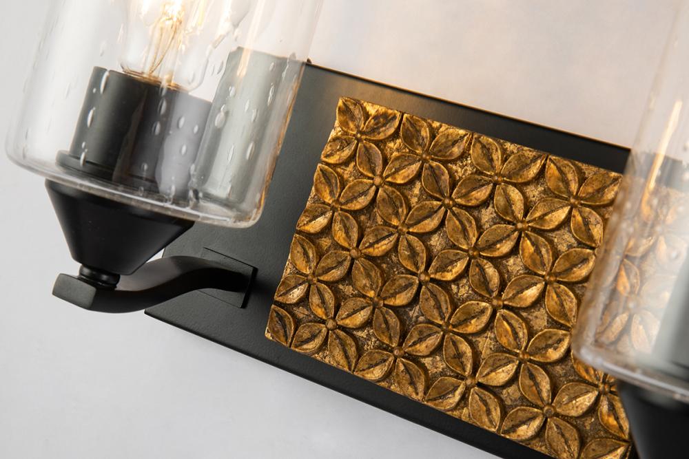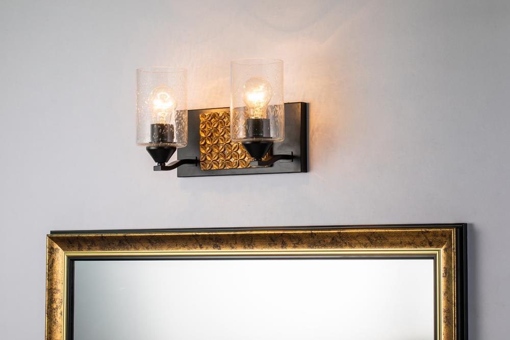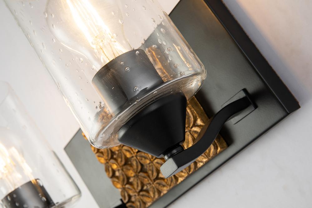 A 13" x 8" x 6.5" 2-light vanity in matte black and antique gold with a textured backplate and cylinder seeded glass. Adds Arcadia-inspired texture to bathrooms.