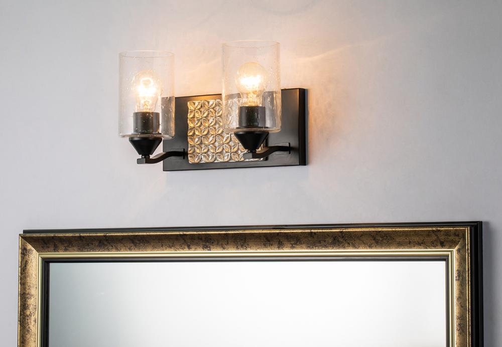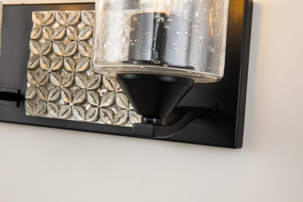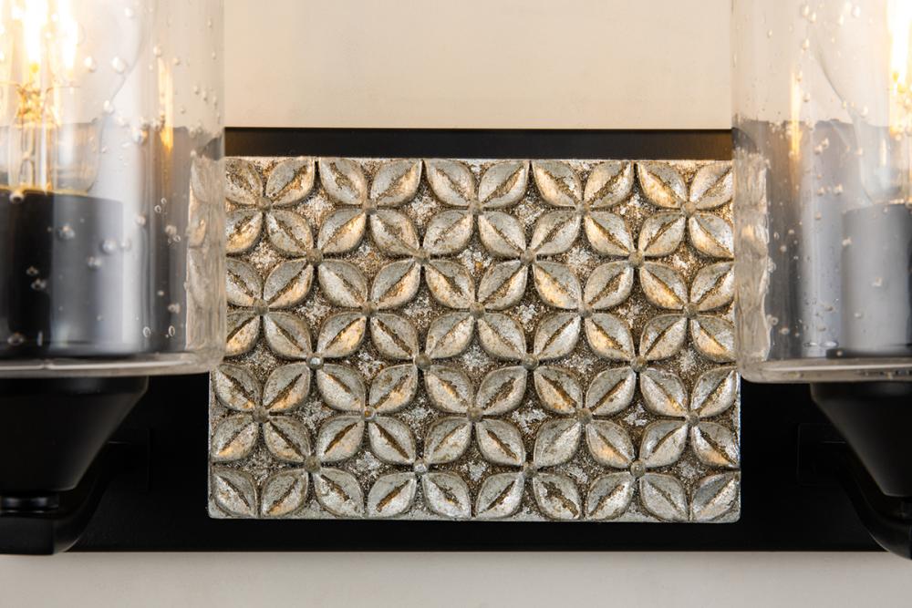 A 13" x 8" x 6.5" 2-light vanity in matte black and antique silver with a textured backplate and cylinder seeded glass. Brings Arcadia-inspired texture to bathrooms.