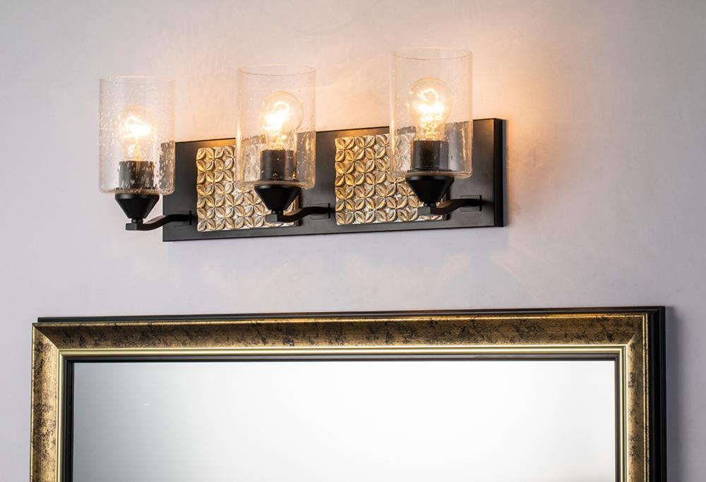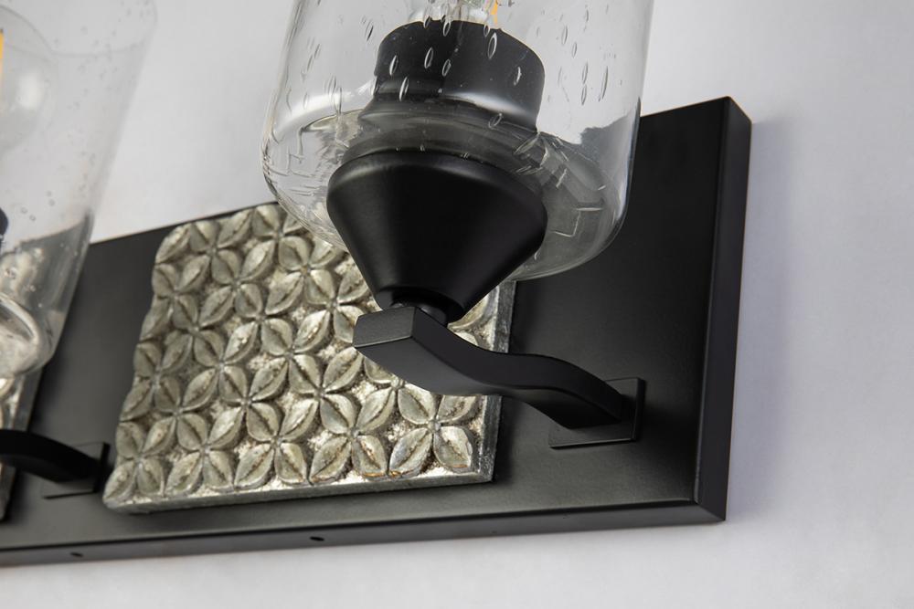A 23" x 8" x 6.5" 3-light vanity in matte black and antique silver with a textured backplate and cylinder seeded glass. Brings Arcadia-inspired texture to bathrooms.