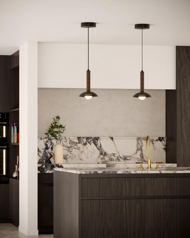 Add distinctive character to your space with the Arden lighting collection. Featuring ribbed details for added texture, Arden offers versatility with a decorative half shade or exposed opal glass globe for a minimalist mood. The black finish, accented by walnut wood veneer, brings a rustic or industrial charm to the design.