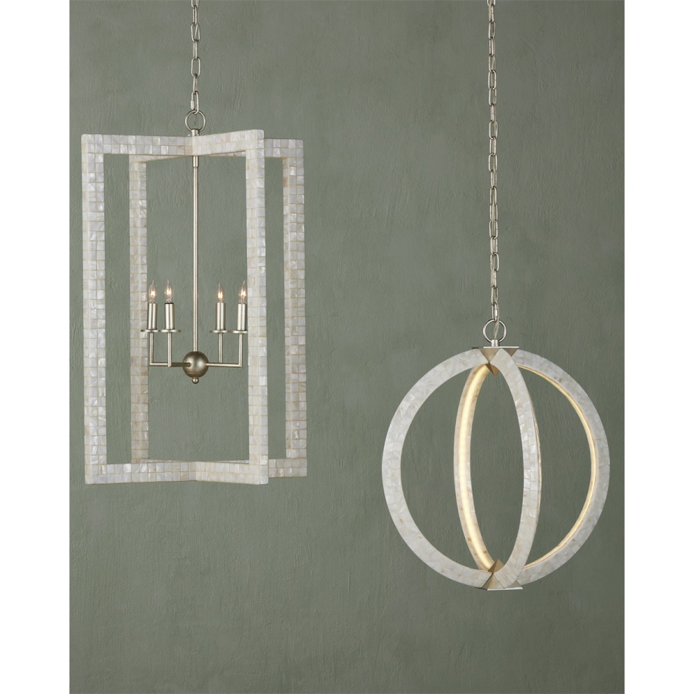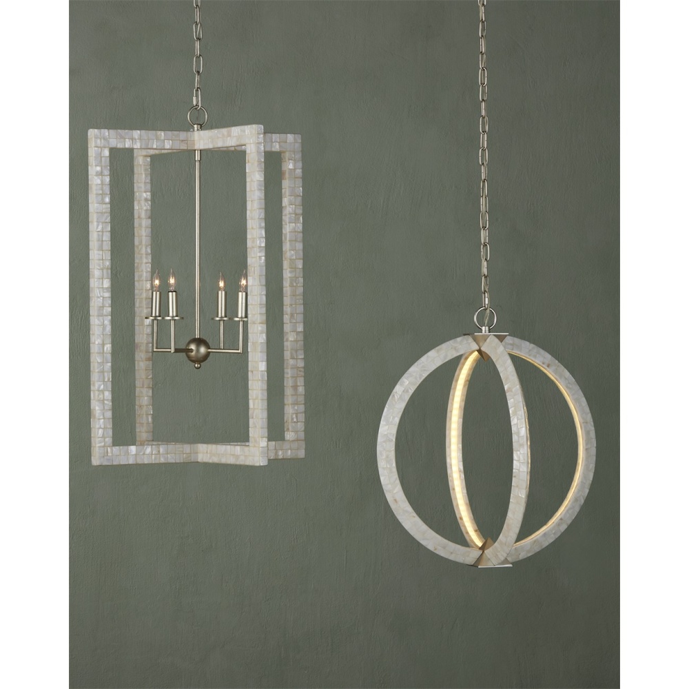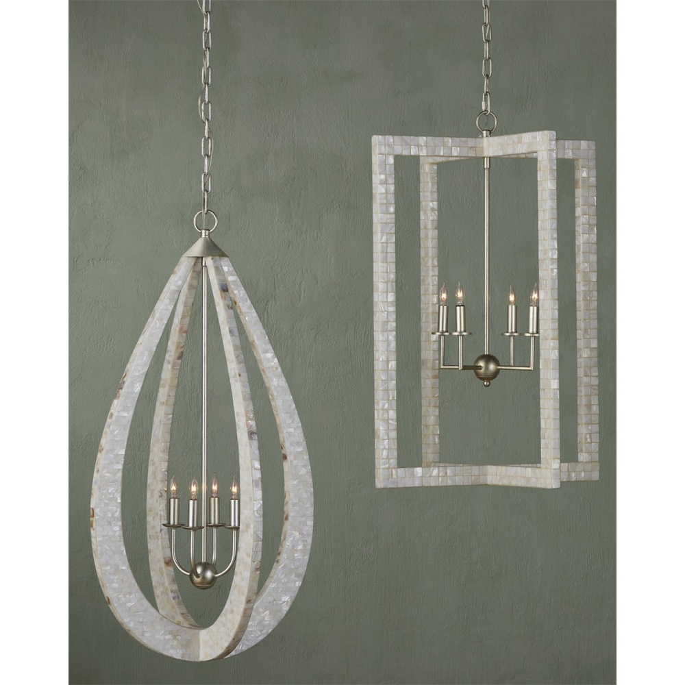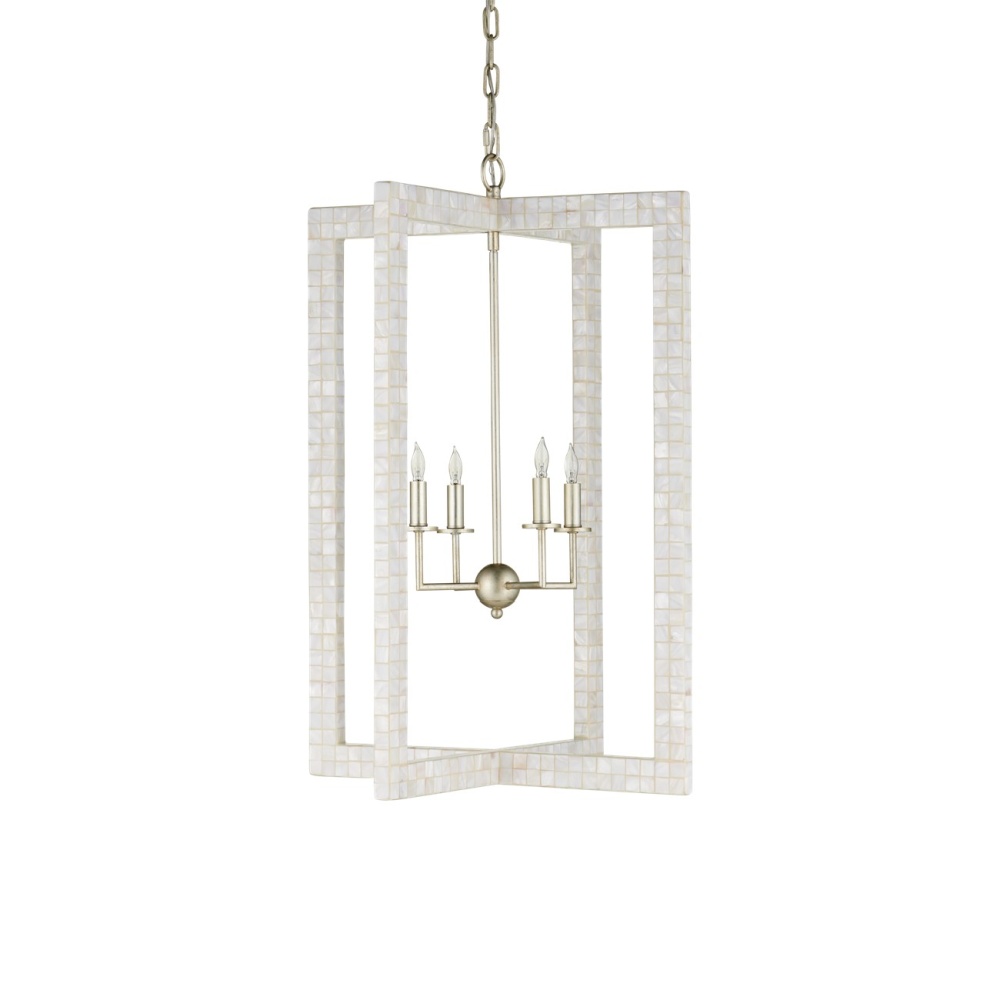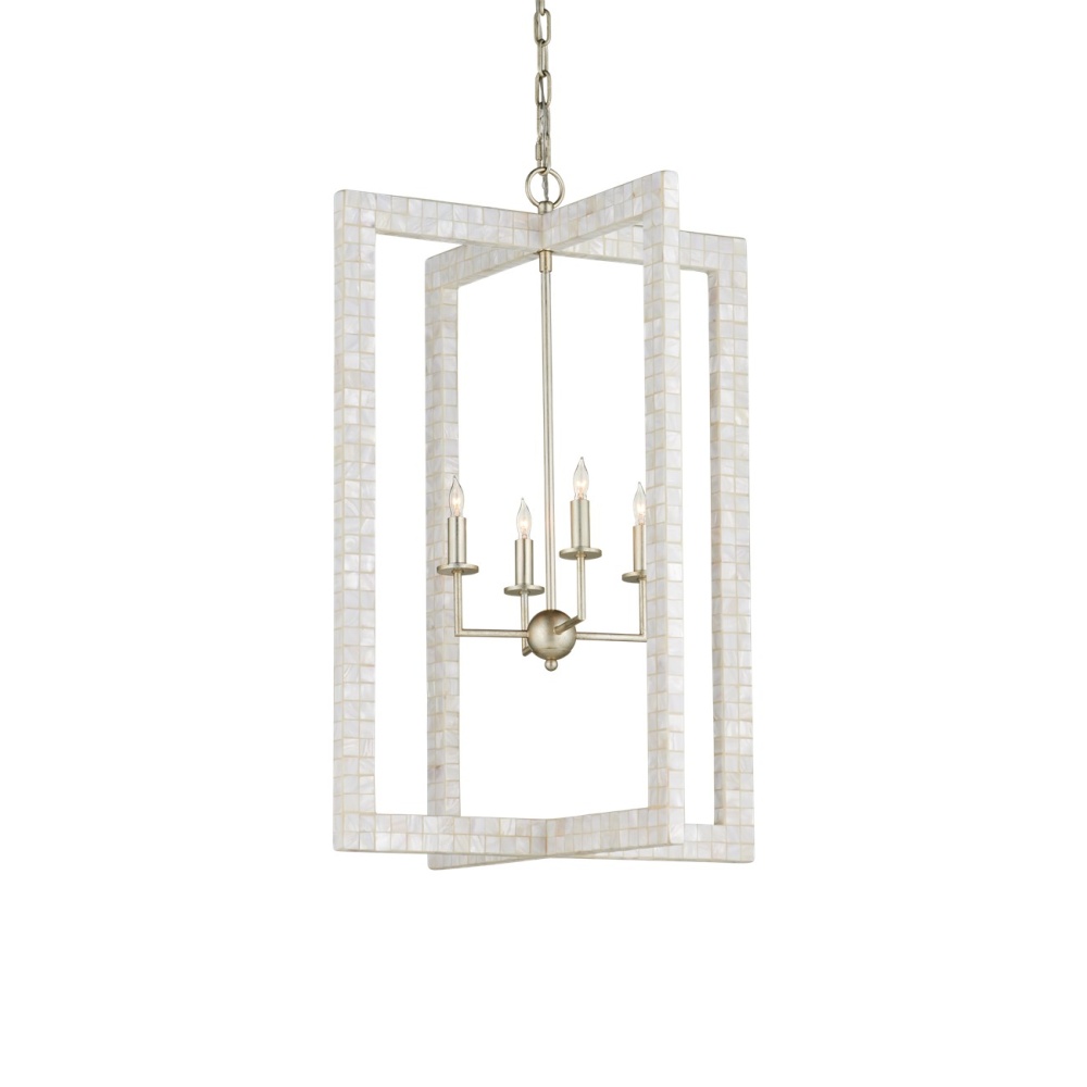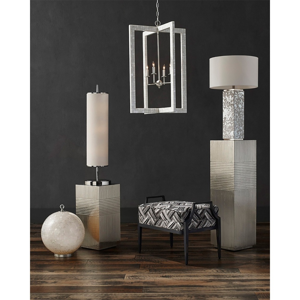 With thin rectangles covered in hand-applied mother-of-pearl mosaic, our Arietta Chandelier is an example of how talented our finish artisans are when it comes to handcrafted surfaces. The metal in a contemporary silver leaf finish enhances the glow of the fixture when the four lights of the silver chandelier illuminate. Adjustable from 38.75" to 106.75" with use of included chain/rod kit/cable. If your space calls for a longer drop, additional chain/rods/cable is available for purchase.