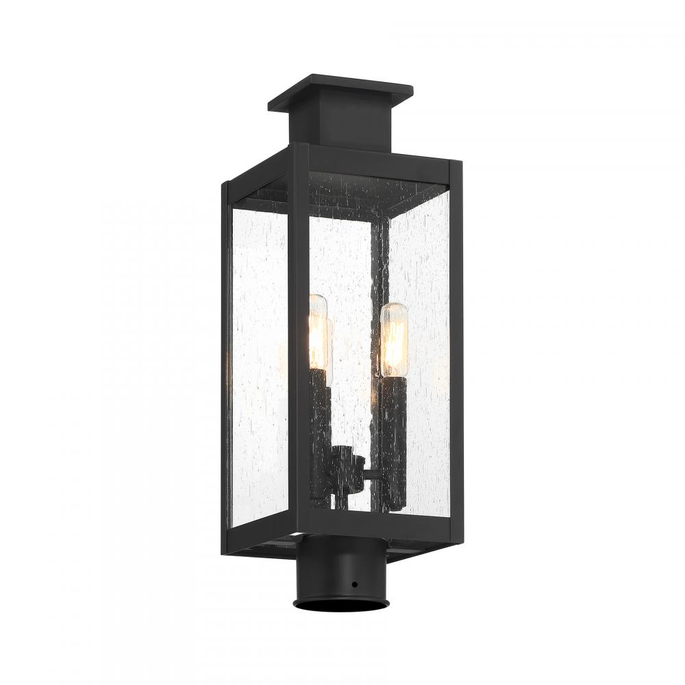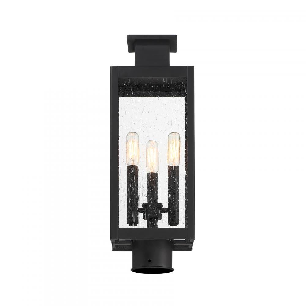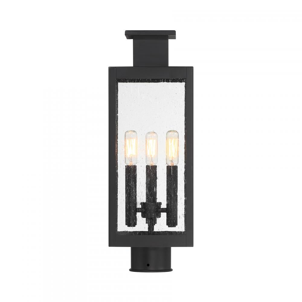 The Savoy House Ascott 3-light outdoor post lantern is a standout source of cool contemporary lighting style for great first impressions. Sleek and slender, Ascott features lights inside panes of clear seeded glass in a sharply angled frame. Matte Black finish. Ascott is 18.75" in height and 6.5" in width. Uses three candelabra size bulbs of up to 60 watts per bulb. Bulbs not included. Wet area rated.