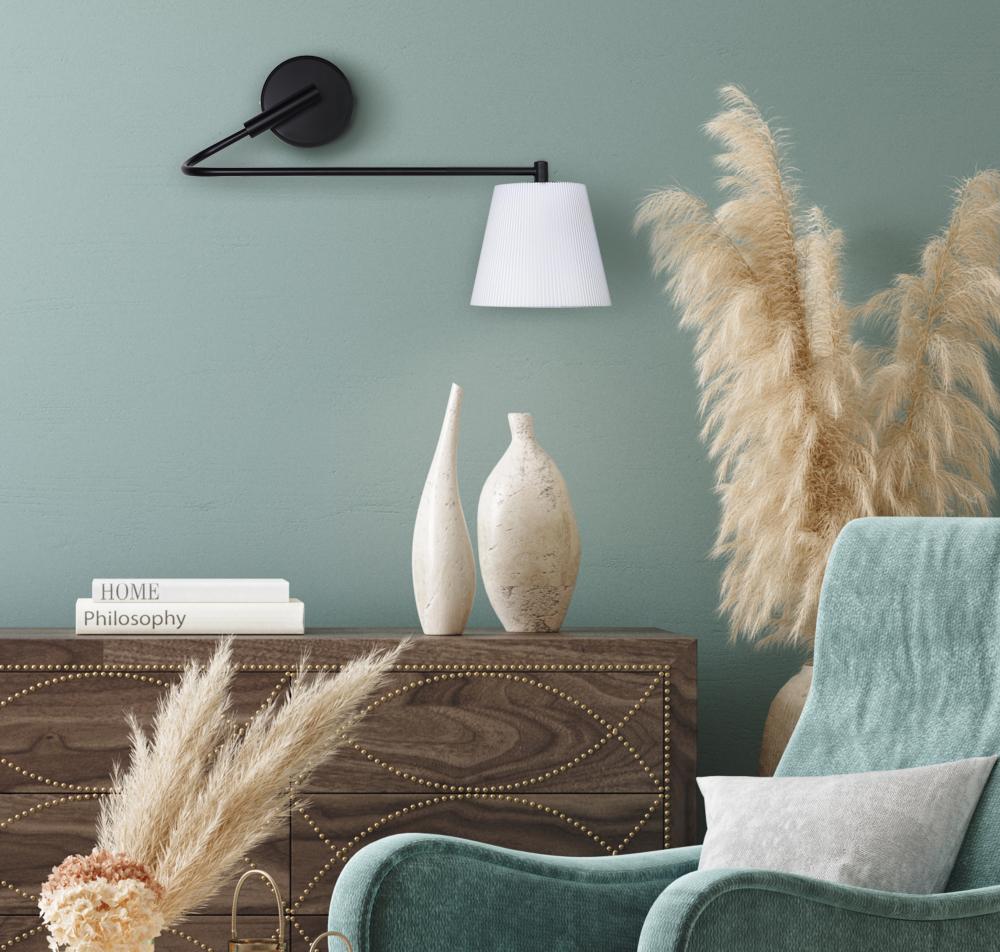 ASPEN, IWF1201A01BK, 1 Lt Wall Fixture, White Ribbed Fabric Shade, 60W Type A, 22inch W x 13.25inch H x 9inch, Easy Connect Included