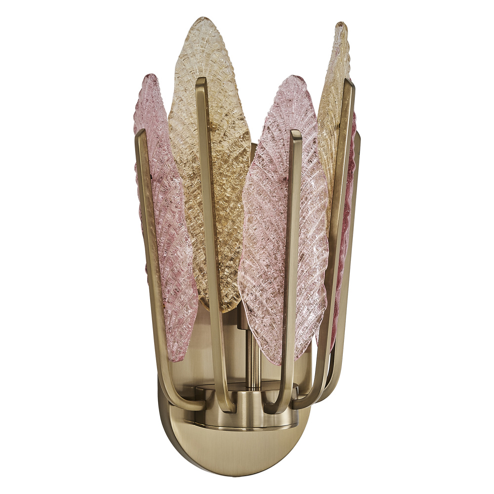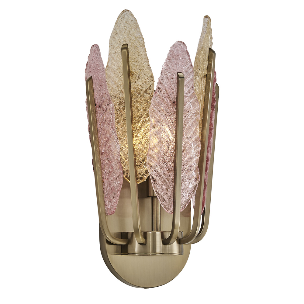 colors and lightness to any space. Numerous gold and pink tinted glass leaves feature a dual sided surface,