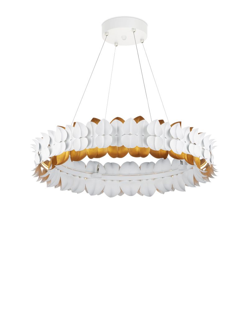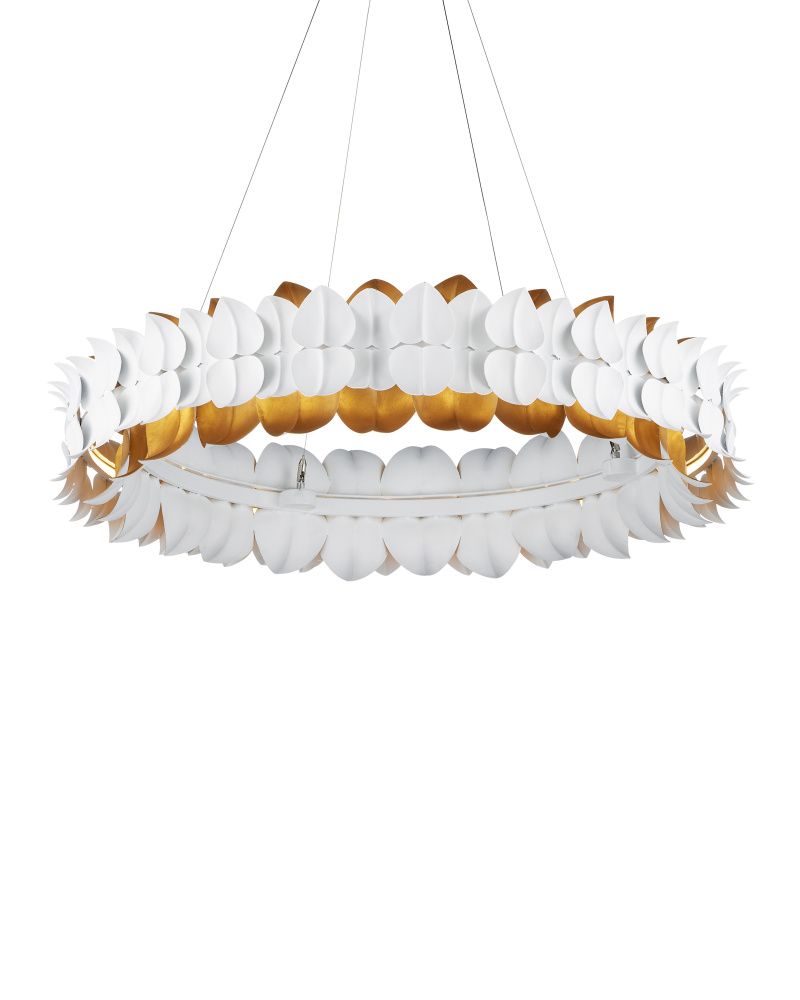 The Aventine Chandelier is a layered design with pretty leaves in a mix of finishes. The exterior of both rows are in a gesso white finish, while the backs of the inner ring are in a contemporary gold finish for a beautiful contrast. The gold leaves also warm the illumination from the integrated LED strips that sit between the rows. Adjustable from 26" to 150" with use of included chain/rod kit/cable. If your space calls for a longer drop, additional chain/rods/cable is available for purchase.