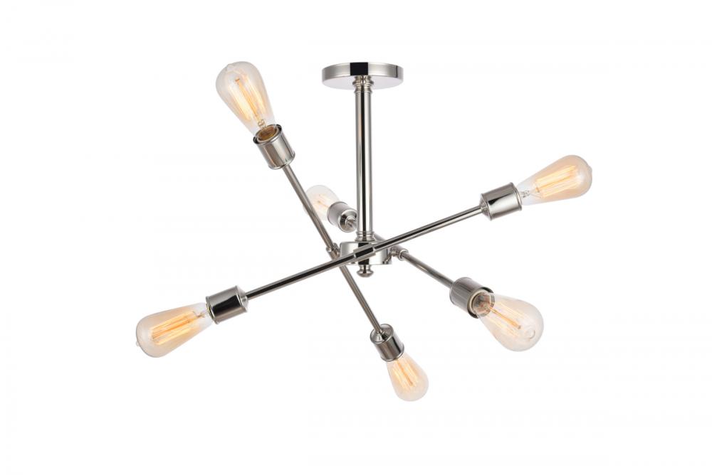 Modern sophistication with a jaunty presentation. Axel flush-mount ceiling lamps feature three adjustable crossing arms mounted on a circular base to direct light in any direction. A total of six light sources (bulbs not included) promises utility anywhere – kitchen, bathroom, or over the dining table. The absence of shades says industrial; the design says penthouse. The smooth steel hardware is finished in reflective polished nickel, adding to the art deco flair. Stylish and cutting-edge without being too eccentric.