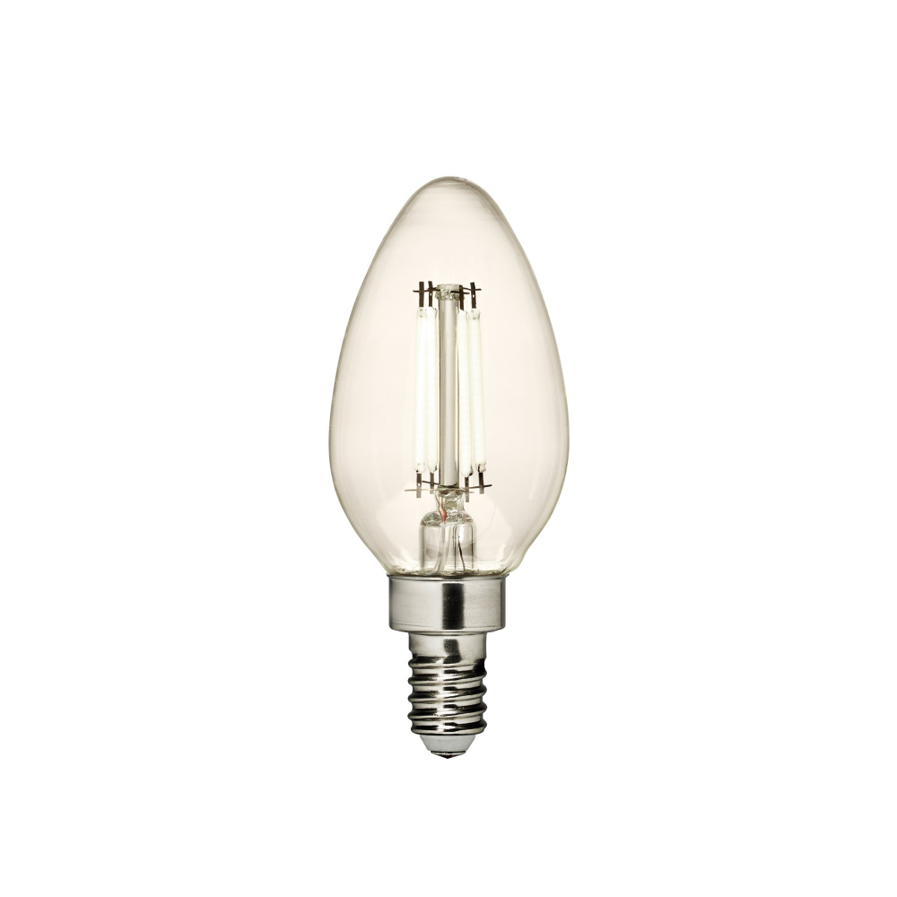 Warm 2700K clear B11 4W LED delivering 350 lumens; perfect for cozy, decorative lighting.