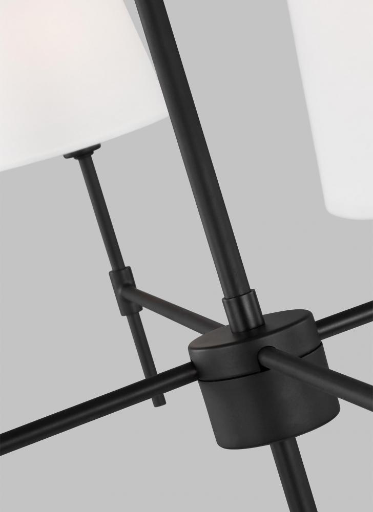 The Baker four light single tier chandelier in midnight black provides abundant light to your home, while adding style and interest. A lantern-like design with curved arms connecting to a cube-shaped frame