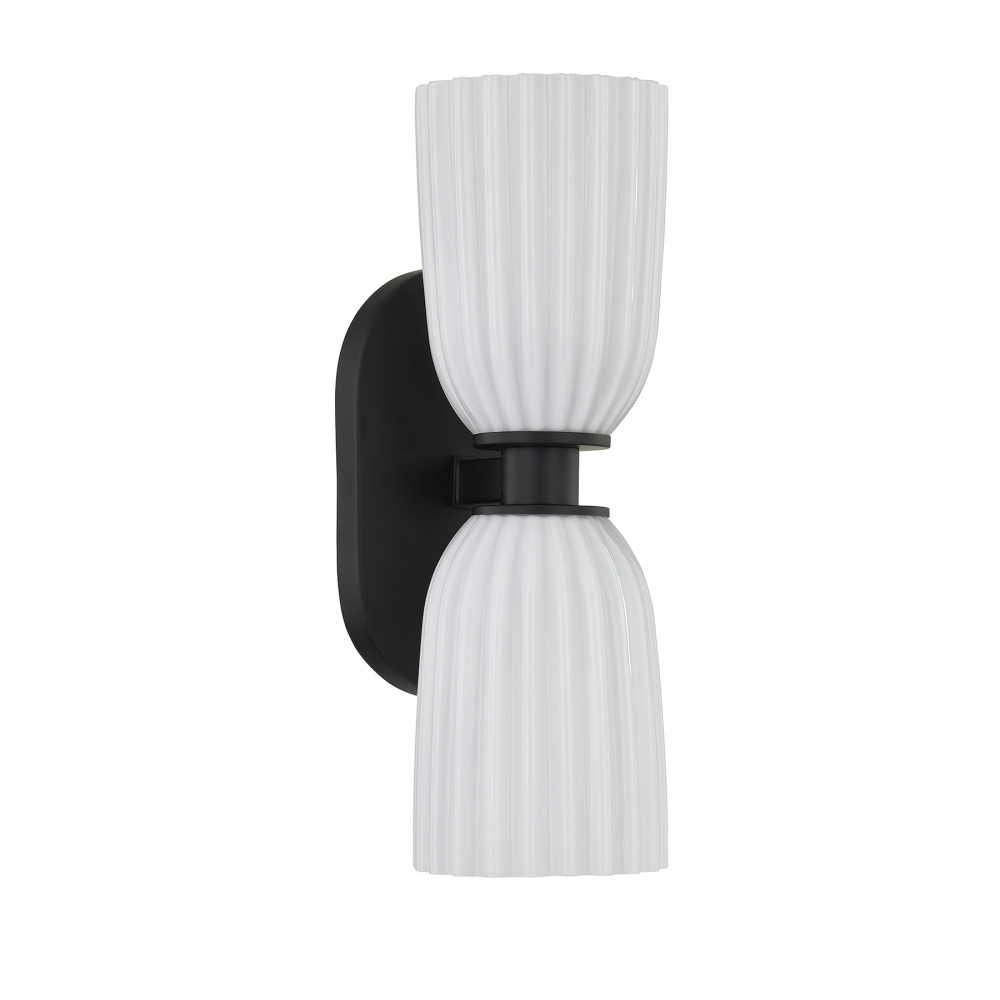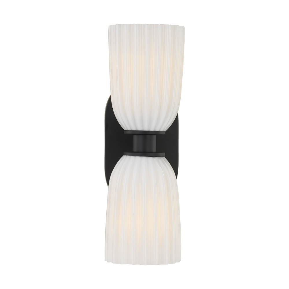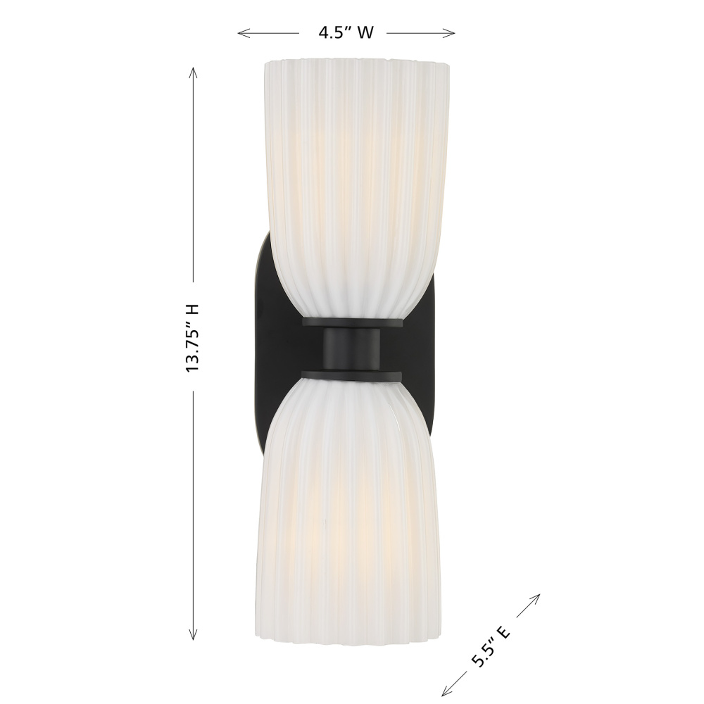 The Savoy House Baldwin 2-light sconce delivers striking contrast and artful simplicity. Its Matte Black finish anchors the design while two ribbed opal glass shades soften the look with a warm, welcoming glow. Baldwin is 13.75" in height, 4.5" in width and extends 5.5" from the wall. It uses two standard size bulbs of up to 60 watts per bulb. Bulbs not included. Damp area rated.