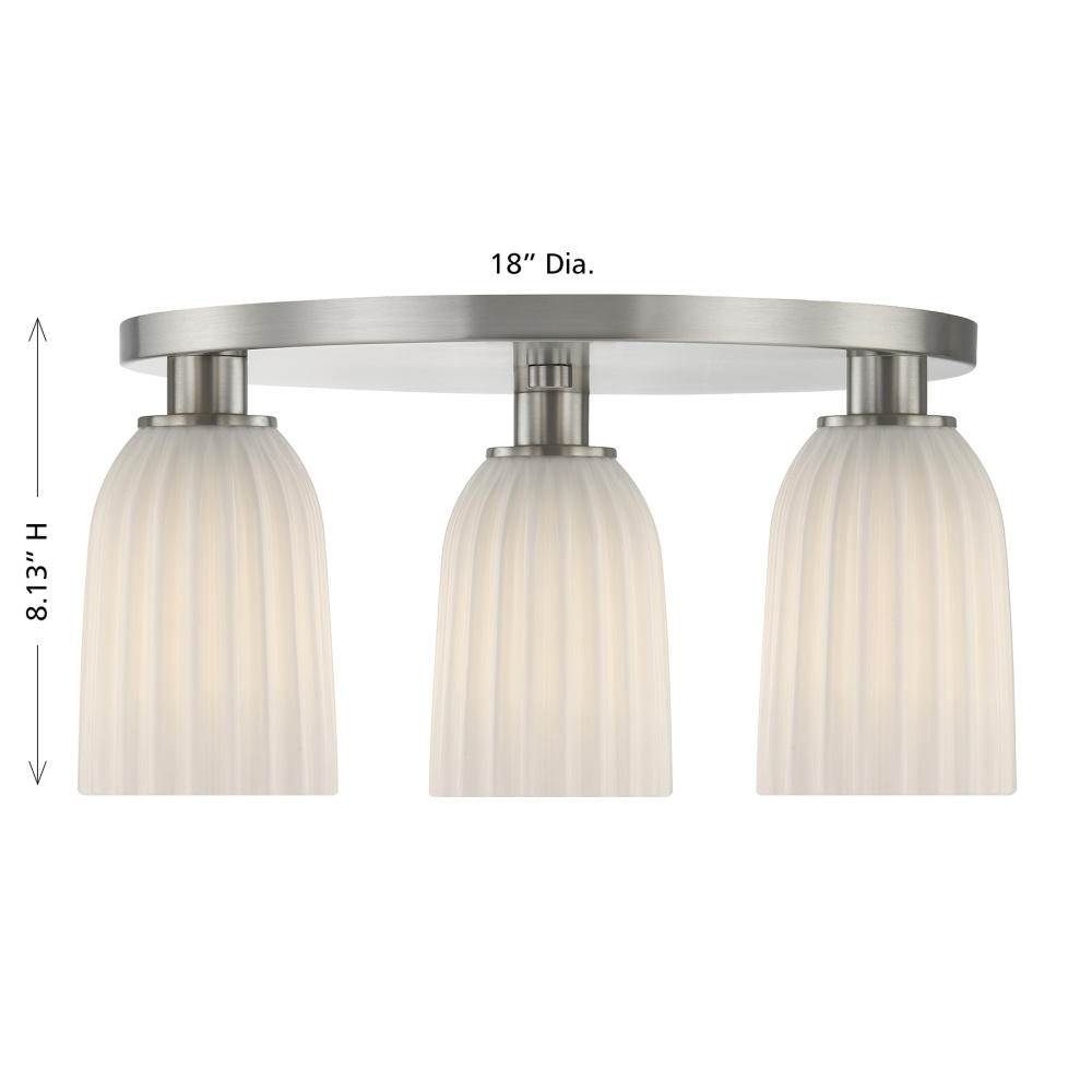 Give any ceiling a clean, contemporary lift with the Savoy House Baldwin 3-light flush mount. The Satin Nickel finish pairs beautifully with the ribbed opal glass shades, which introduce subtle texture and a soft diffusion of light. Baldwin is 8.13" in height and 18" in width. It uses three standard size bulbs of up to 60 watts per bulb. Bulbs not included.