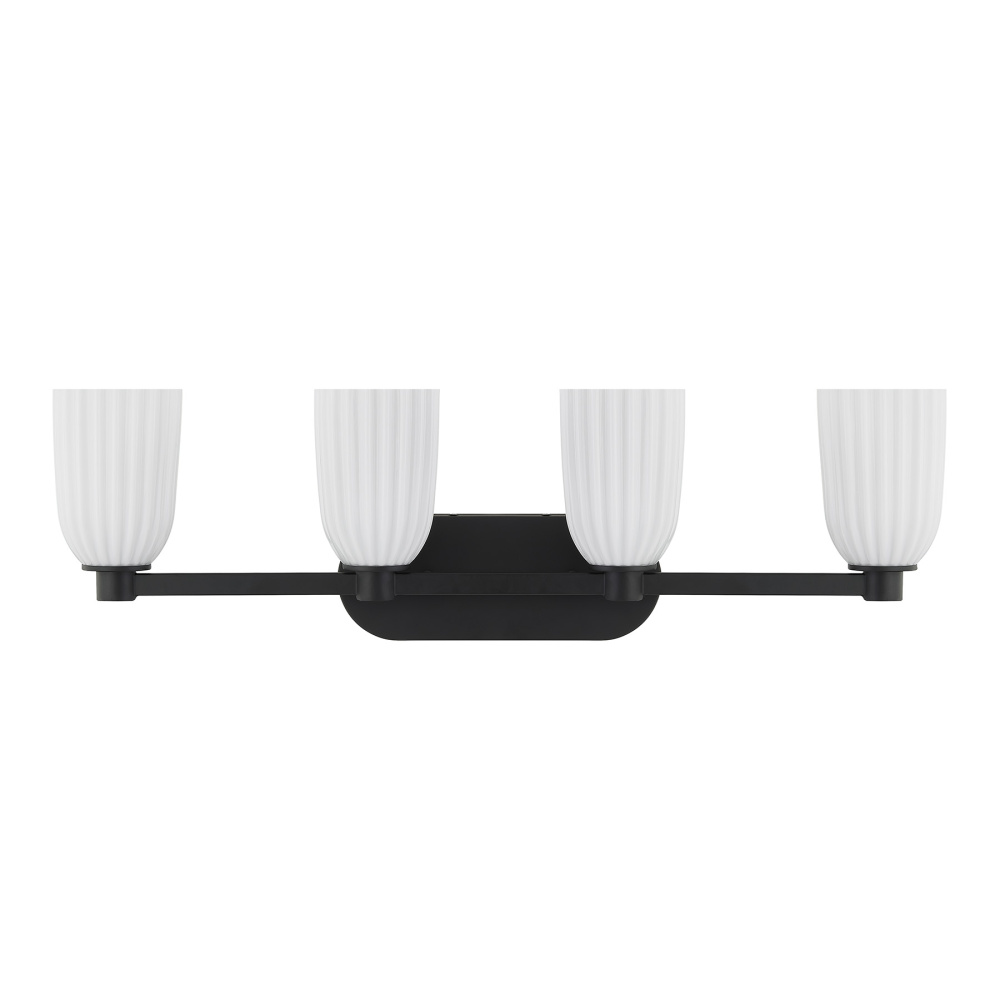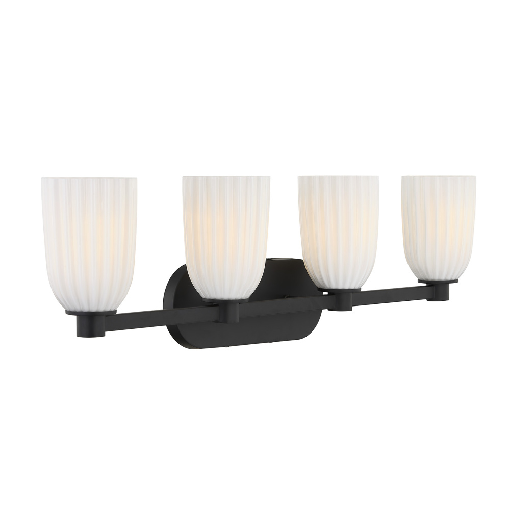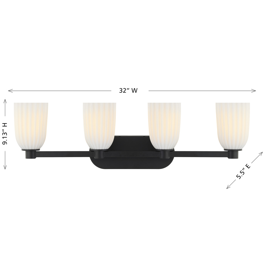Bold yet beautifully understated, the Savoy House Baldwin 4-light bath bar layers a Matte Black finish with glowing ribbed opal glass to create striking modern contrast. Ideal for adding dimension and warmth to any bath. Baldwin stands 9.13" tall, spans 32", and extends 5.5" from the wall. It uses four standard size bulbs of up to 60 watts per bulb. Bulbs not included. Damp area rated and installable horizontally or vertically.