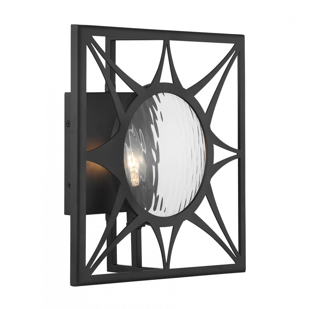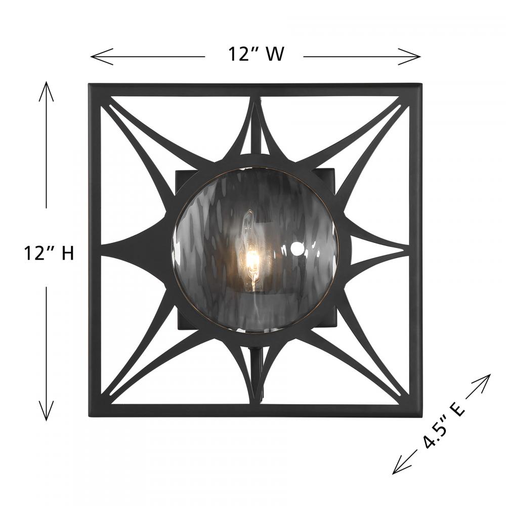 Let your sense of style shine through with the beautiful Balfour 1-light sconce from Savoy House! Its cube-shaped structure wears a Matte Black finish and is decorated with an eye-catching starburst pattern that holds a circular pane of clear water glass. Balfour is 12" in height, 12" in width and extends 4.5" from the wall. It uses one candelabra size bulb of up to 60 watts. Bulb not included. This sconce is damp area rated.