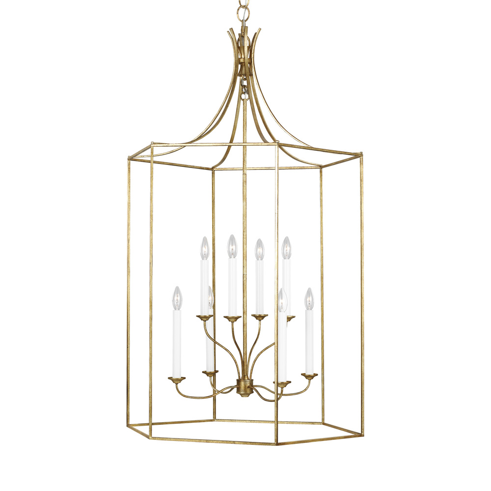 The Bantry House lanterns from Alexa Hampton sport an open, airy frame with an elegant, birdcage-like design. Slim, straight metal bars swoop down from the canopy to align around the main drum-shaped frame. The central column suspends an inner, candelabra structure, with four curved light arms, simple candle cups and a globe canopy. Bantry House four light indoor pendant in antique gild provides abundant light to your home, while adding style and interest.