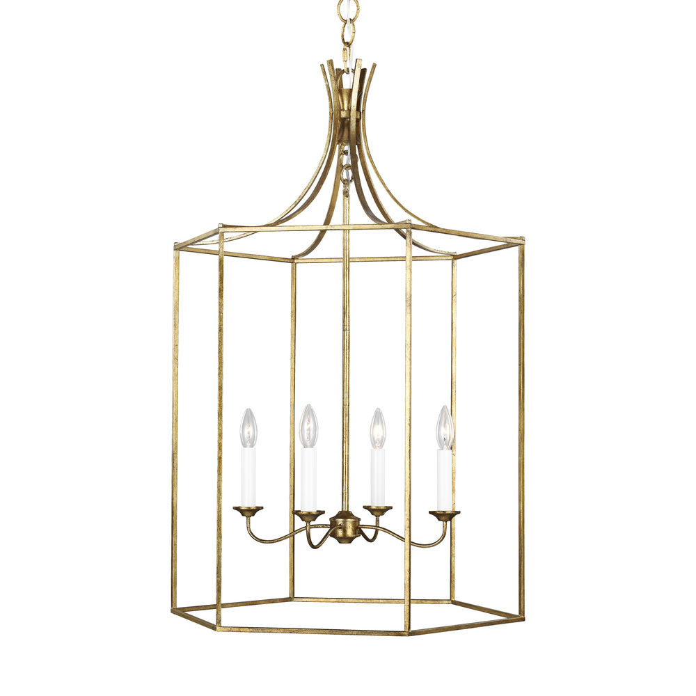 The Bantry House lanterns from Alexa Hampton sport an open, airy frame with an elegant, birdcage-like design. Slim, straight metal bars swoop down from the canopy to align around the main drum-shaped frame. The central column suspends an inner, candelabra structure, with four curved light arms, simple candle cups and a globe canopy. Bantry House four light indoor pendant in antique gild provides abundant light to your home, while adding style and interest.