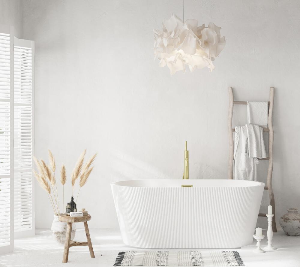 Elevate your bathroom’s aesthetic with this stunning freestanding soaking bathtub, featuring a vertical fluted exterior design that adds texture and sophistication to any space.