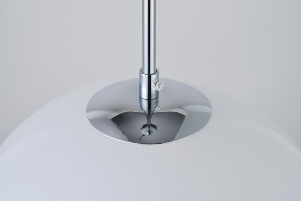Refined style with a practical design, Baxter hanging pendant lamps bring cosmopolitan sophistication anywhere, especially to an entryway, office, bathroom, bedroom, or kitchen. The smooth iron frame features a disk-shaped canopy and comes in a chrome finish. An adjustable black cord allows you to vary the hanging height from 27 to 72 inches. The frosted white spherical glass shade remains open at the center to allow for effortless replacement of the filament-style bulb (not included). Living in the big city has never been this easy.