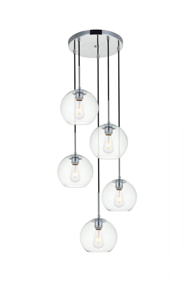 Refined style with a practical design, Baxter hanging pendant lamps bring cosmopolitan sophistication anywhere, especially to an entryway, office, bathroom, bedroom, or kitchen. The smooth iron frame features a disk-shaped canopy and comes in a chrome finish. Adjustable black cords allow you to modify the hanging height from 14 to 87 inches. Five identical clear spherical glass shades are suspended at varying heights and remain open at the center to allow for effortless replacement of the filament-style bulbs (not included). Living in the big city has never been this easy.