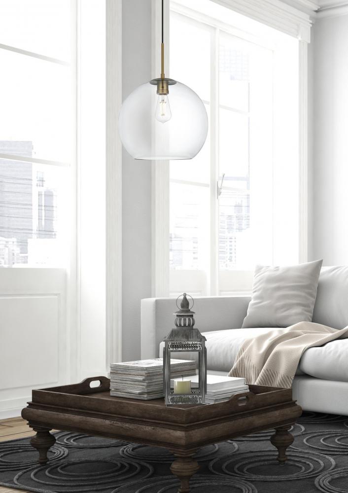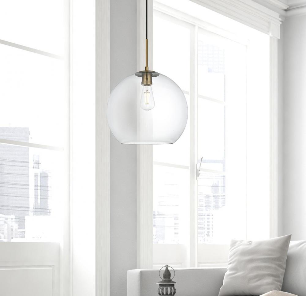 The Baxter hanging pendant light combines refined style with a practical design, adding cosmopolitan sophistication to any space—be it an entryway, hallway, bathroom, kitchen, or closet. The sleek iron frame, complete with a disk-shaped canopy, elegantly supports a clear spherical glass shade that stays open at the center, making bulb replacement effortless. Designed for those who love the look of big-city elegance, the Baxter pendant makes sophisticated living easy.