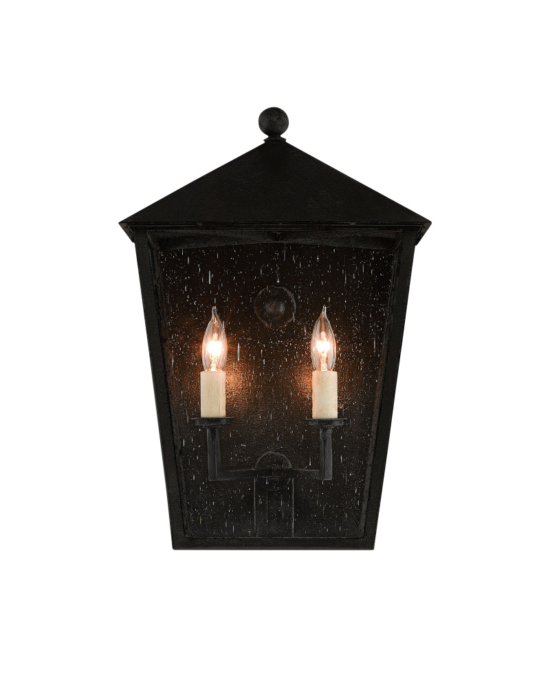 The medium version of the Bening Outdoor Wall Sconce is one of twelve fixtures in our Twelfth Street collection of outdoor lighting that features a Trilux finish, the next generation of high-performance, weather-resistant finishing technology brought to the market exclusively by Currey & Company. The coating provides three levels of protection, and is fade resistant, crack resistant and rust resistant. We guarantee the finishes applied to our Twelfth Street pieces for five years. The metal on this sconce in the collection has been treated to our midnight finish that surrounds seeded-glass panes that turn the illumination to a soft glow.