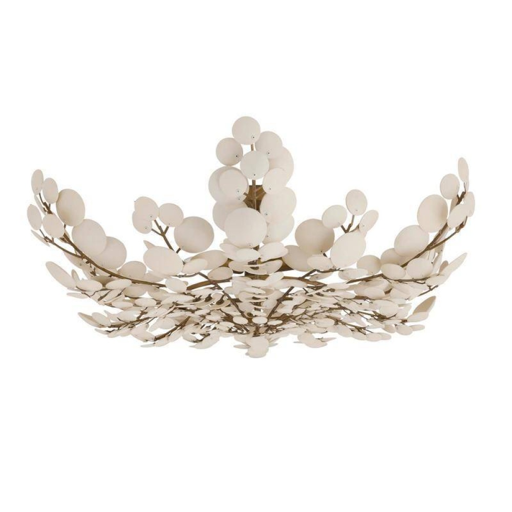 The lush allure of tropical foliage informs the Bilal. From afar, this botanically inspired fixture resembles metal but is cleverly constructed of coconut shells. Updated in a neutral ivory hue, it is a stylish companion to our Bilal chandelier. Suspended from an antique brass iron canopy. Finish will vary.