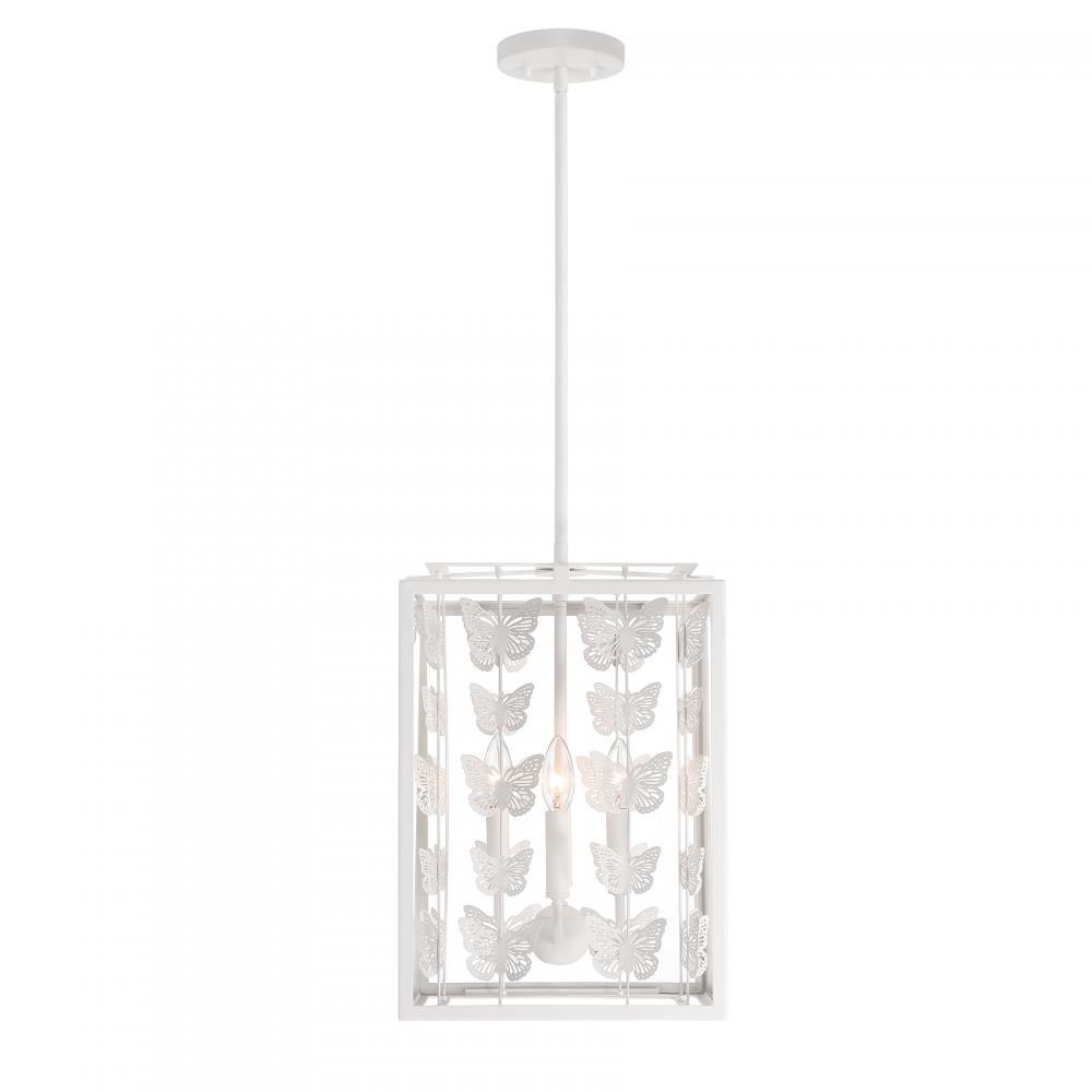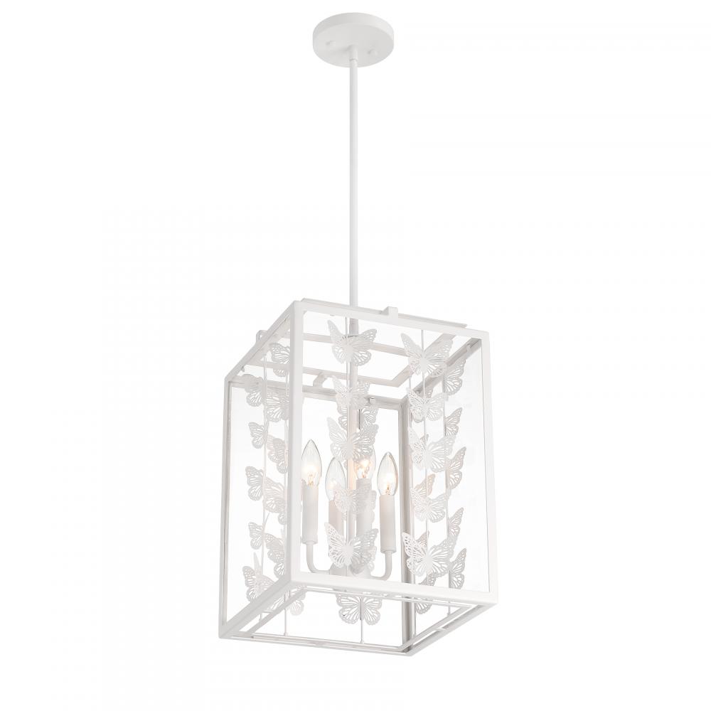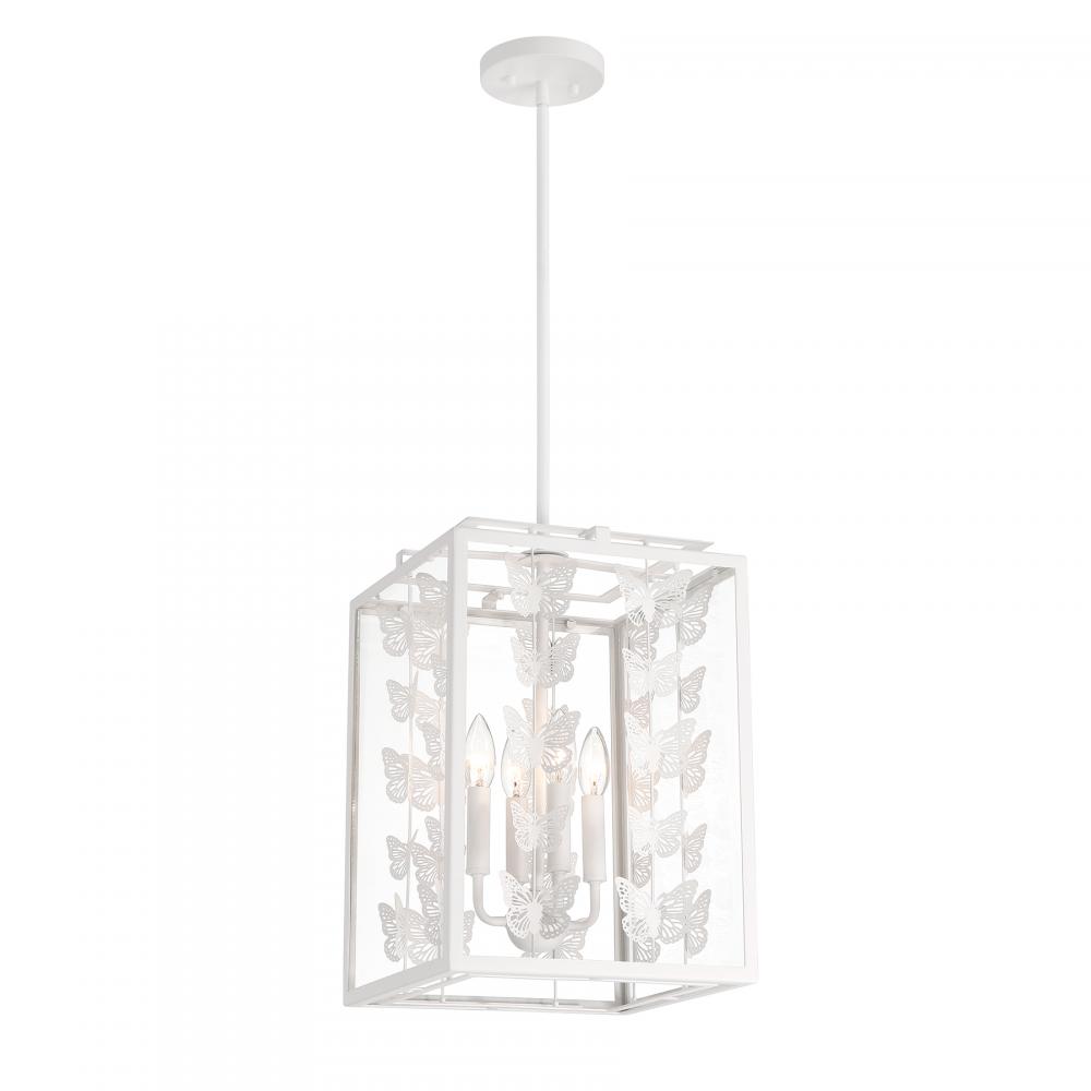Add a little magic to any room with the whimsical Savoy House Birch 4-light pendant, which features a geometric structure adorned with rows of lovely metal butterflies finished in Bisque White. Clear glass panes frame everything beautifully. Birch is 12" in width and has an adjustable height ranging from 17" to 71". Comes with four 12" downrods and one 6" downrod. Uses four candelabra size bulbs of up to 60 watts per bulb. Bulbs are not included.