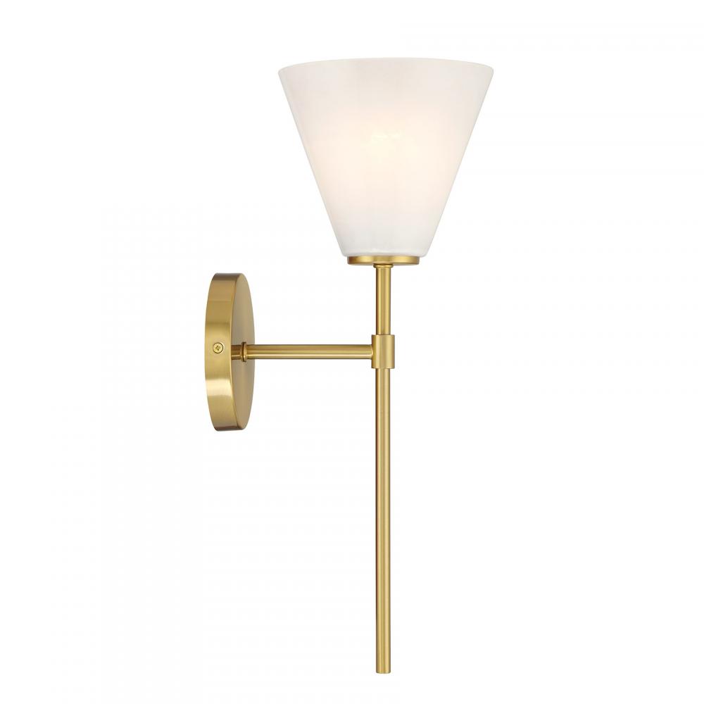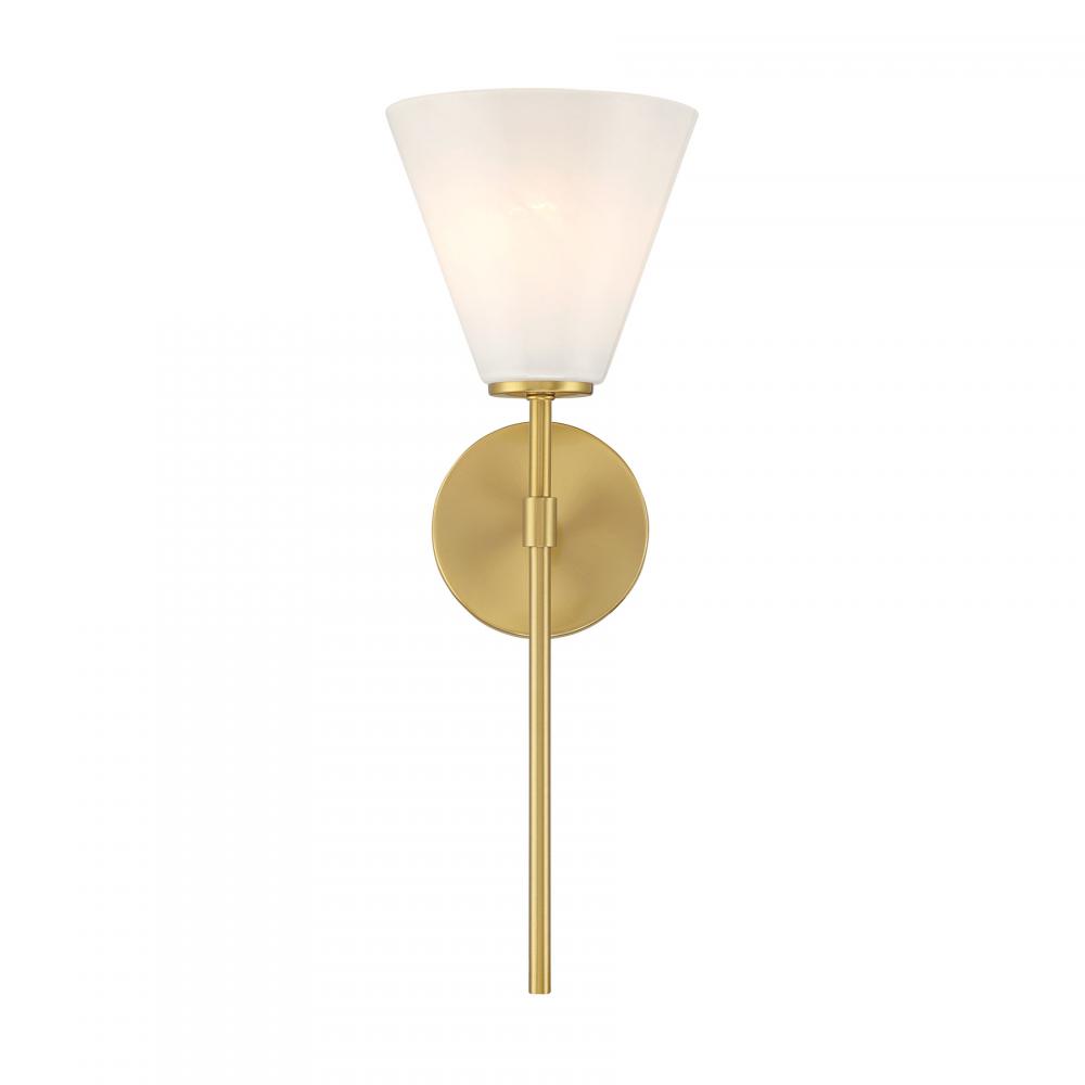 This Savoy House Blair 1-light sconce is oh so versatile! It is finished in Warm Brass and holds a shade of spectacularly swirling strie glass. Blair is 17.5" in height, 6.25" in width and extends 8.25" from the wall. Uses one standard size bulb of up to 60 watts. Bulb not included. This sconce is damp area rated.