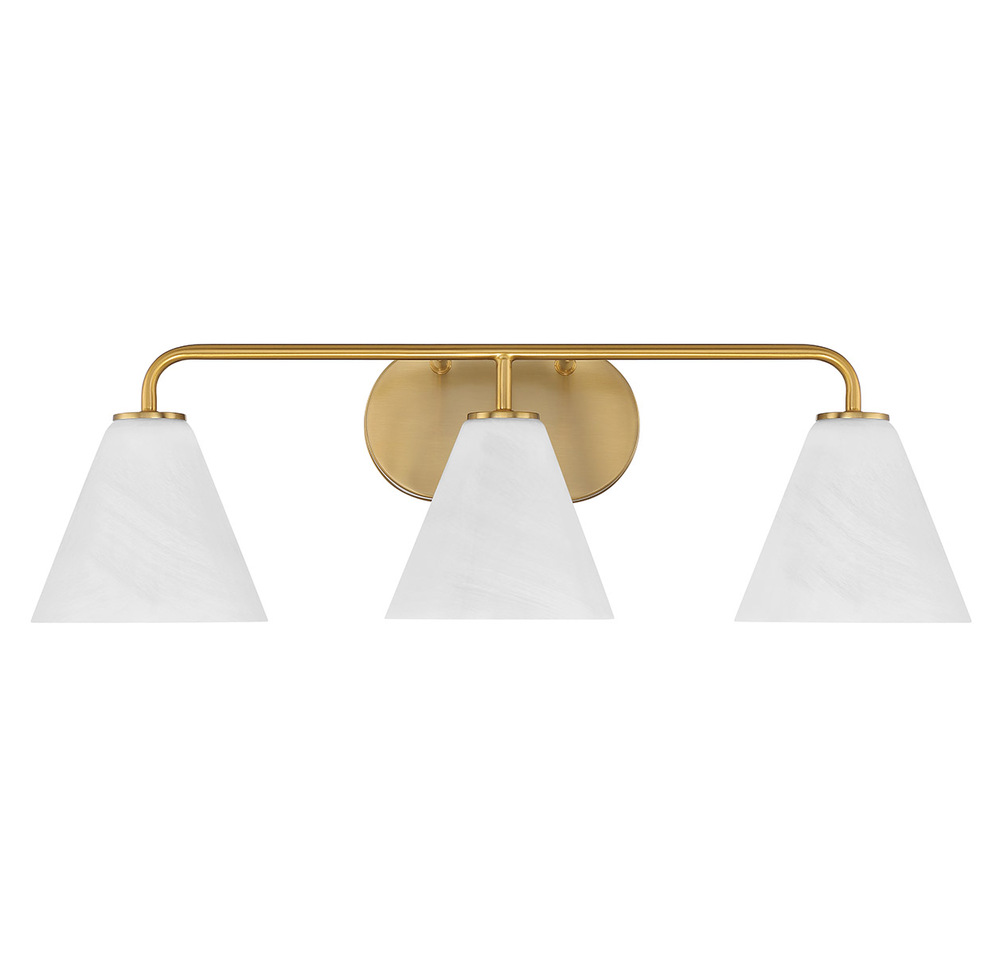 Get a warm and welcoming glow at the vanity with the Savoy House Blair 3-light bath light. Conical shades of white strie glass feature eye-catching wisps and swirls that add a touch of dimension and intrigue. The glass contrasts nicely with the versatile Warm Brass finish. Blair is 8" in height, 25.5" in width and extends 8.5" from the wall. Uses three standard size bulbs of up to 60 watts per bulb. Bulbs not included. This bath light is damp area rated and may be installed with the glass facing up or down.