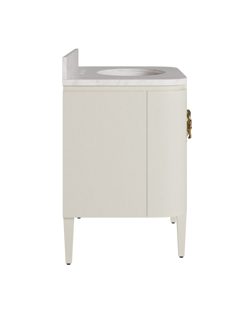 The Briallen 36” White Bath Vanity is a striking design with thoughtful details. Finished in a cerused white, it has a statement-making feature in the brass flower pull in polished brass that adorns the door. Inside, a single adjustable shelf and two optional wood trays that attach to the door provide flexible storage solutions. A Carrara marble top holds an oval undermount sink.