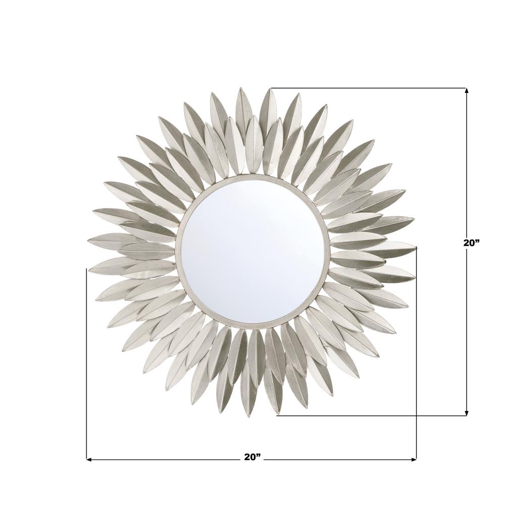 Inspired by Crystorama’s iconic Broche Collection, this stunning mirror brings sculptural artistry to wall décor. The mirror features a radiant sunburst design with hand-forged metal leaves arranged to evoke elegance and organic beauty. The intricate leaf-shaped detailing channels a refined sense of nature-inspired aesthetics, adding warmth and charm to any interior. This mirror is ideal as a focal point in entryways, living rooms, or bedrooms, and it pairs beautifully with contemporary and classic design styles.