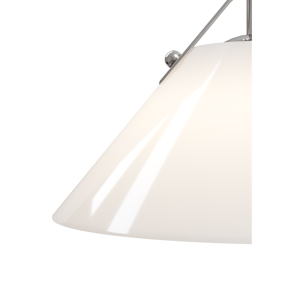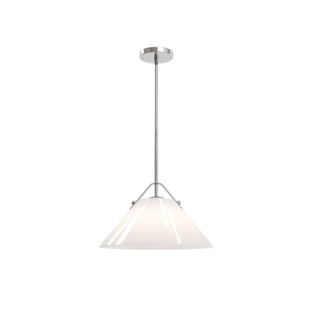 The Bronwen Nickel Pendant is an equestrian-inspired design with a flaring white glass shade fastened to the round canopy with a sophisticated strap—a subtle nod to classic tack hardware. The profile can lean modern farmhouse, though it also complements other design styles. The metal in a polished nickel finish is complements the paleness of the shade, which has a glossy surface that glows. At 19 inches in diameter, the one-light pendant is dimmable. Adjustable from 18" to 60" with use of included chain/rod kit/cable. If your space calls for a longer drop, additional chain/rods/cable is available for purchase.