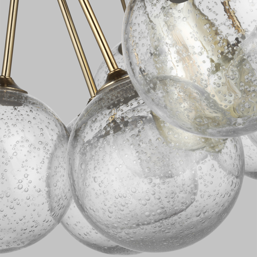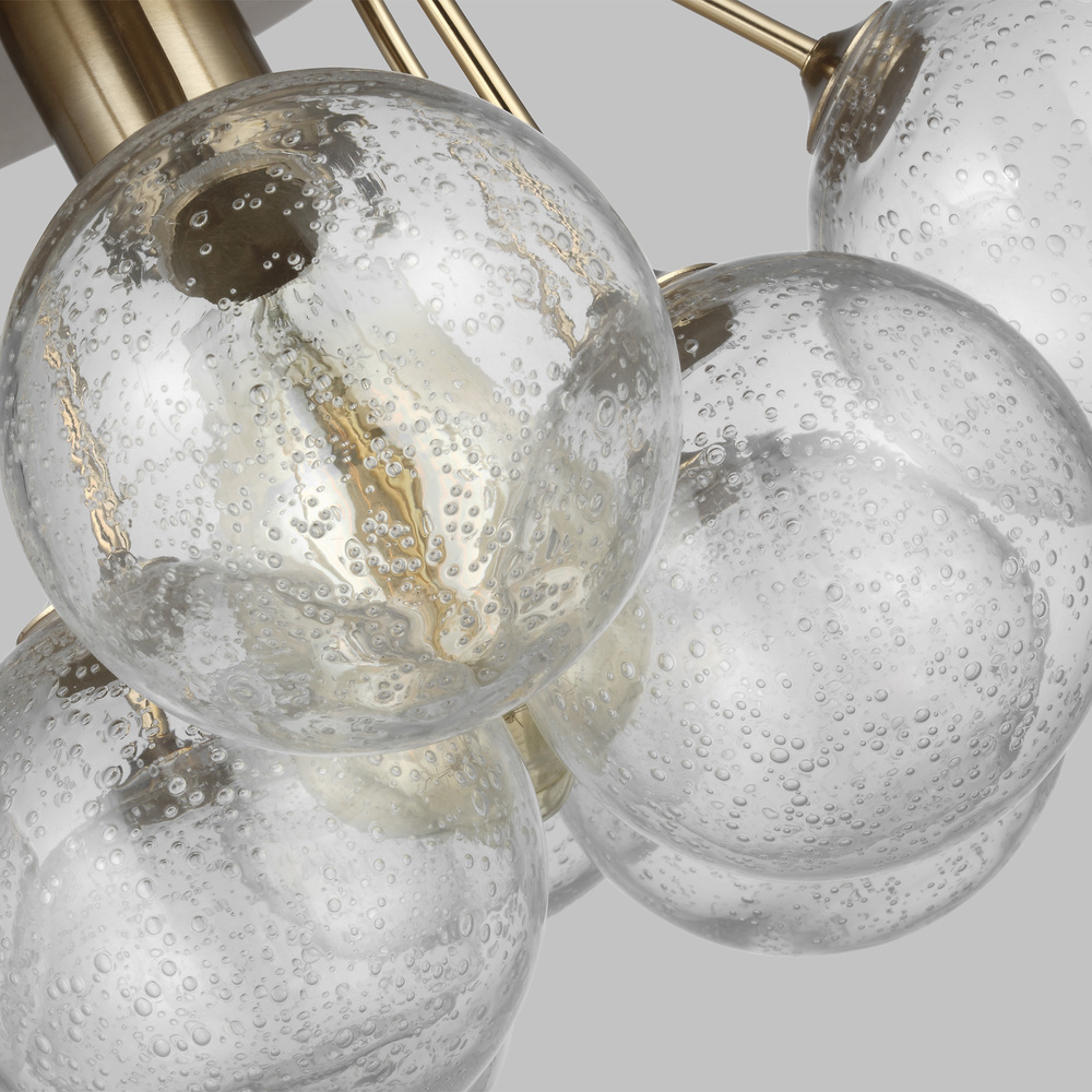 The Bronzeville one light semi flush fixture in satin brass enhances the beauty of your home with ample light and style to match today's trends. Bronzeville brings a daring, upscale element of mid-century modern design to any space. Hand blown, Seeded Glass globes encircle warm, glowing, filament lamps, diffusing the light to create a serene ambiance of light and shadow. Available in two finishes.