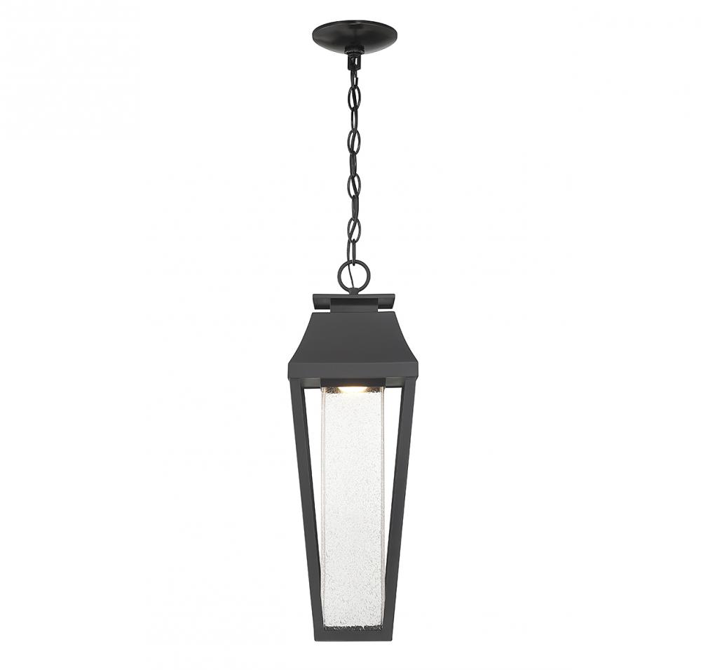 From Savoy House, the Brookline 1-light outdoor hanging light showcases a more contemporary take on classic lantern-style illumination with a central column of clear seeded glass illuminated by integrated LED light. The matte black finish adds versatility. Brookline is 21.75" in height and 7.25" in width.