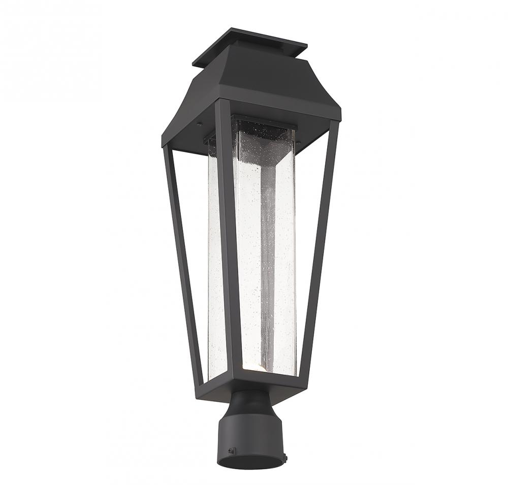 From Savoy House, the Brookline 1-light outdoor post light showcases a more contemporary take on classic lantern-style illumination with a central column of clear seeded glass illuminated by integrated LED light. The matte black finish adds versatility. Brookline is 22.5" in height and 7.25" in width.