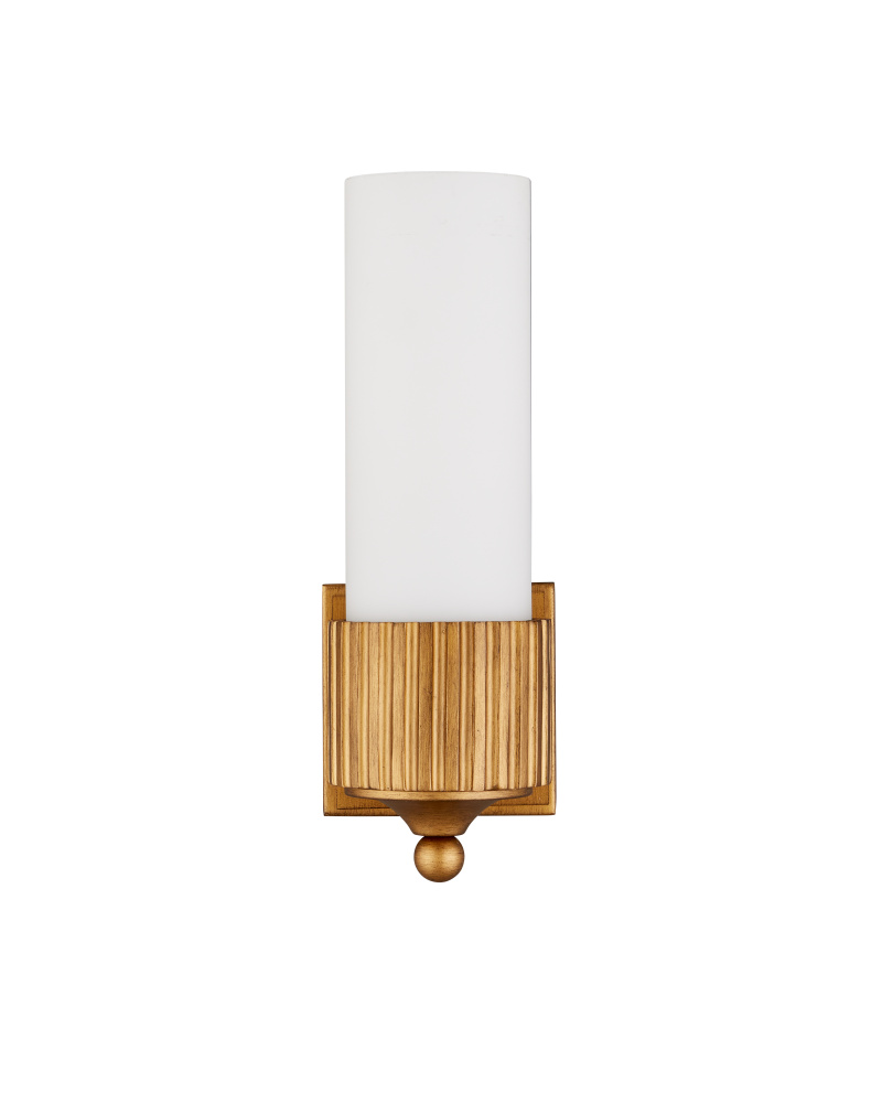 The Bryce Gold Bath Wall Sconce is a clean-lined fixture that will be at home in any number of styles. This simple round form is embellished with a motif that hearkens to industrial gears. Its designer Barry Goralnick is adept at exploring these forms to which a gold finish brings a luminous touch. The classically inspired finial that ornaments the bottom of the sconce is a sophisticated focal point, and the frosted glass tube provides an even glow.