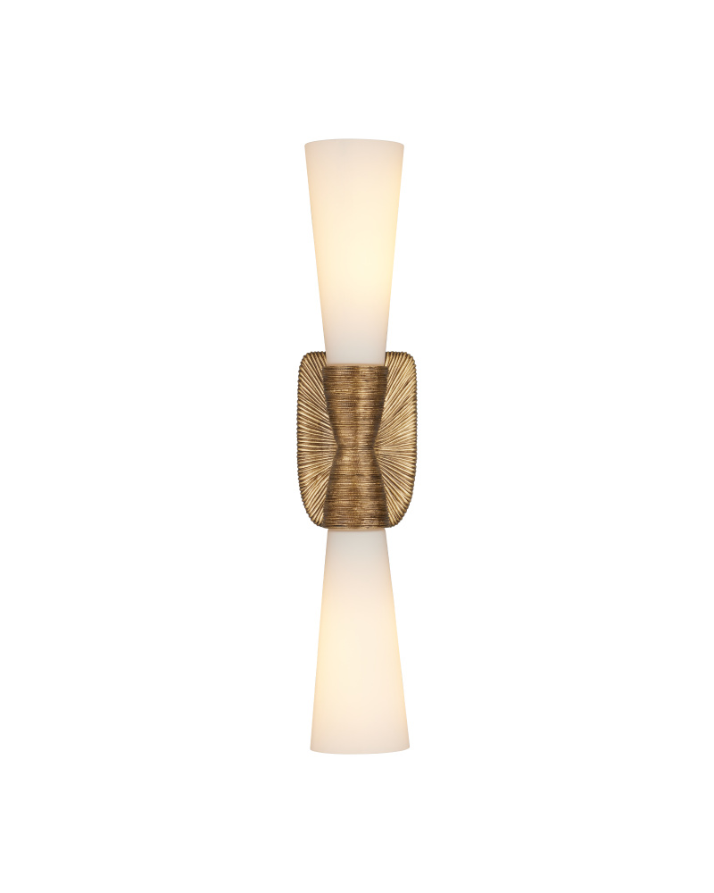 The Burrows Brass Bath Wall Sconce is made of cast brass with tremendous texture on its metal surfaces that resemble flowing strands of hair pulled tightly into a bun. The white glass globes that extend above and below the wallplate form an hour-glass shape that contrasts the metal in an antique brass finish. The two-light sconce, which is 24 inches tall, is dimmable and damp rated.