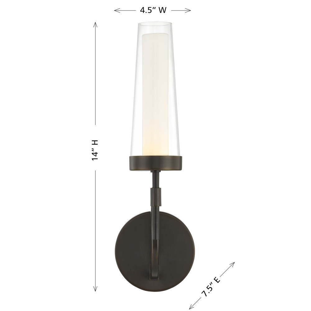 The Savoy House Butler 1-light sconce is an intriguing update to traditional lighting style. Layers of opal and clear glass create the soft, atmospheric light of a traditional taper candle, but with an updated twist. The integrated LED light source brings a bright glow while the Mediterranean Bronze finish adds gorgeous radiance. Butler is 14" in height, 4.5" in width and extends 7.5" from the wall. This sconce is damp area rated.
