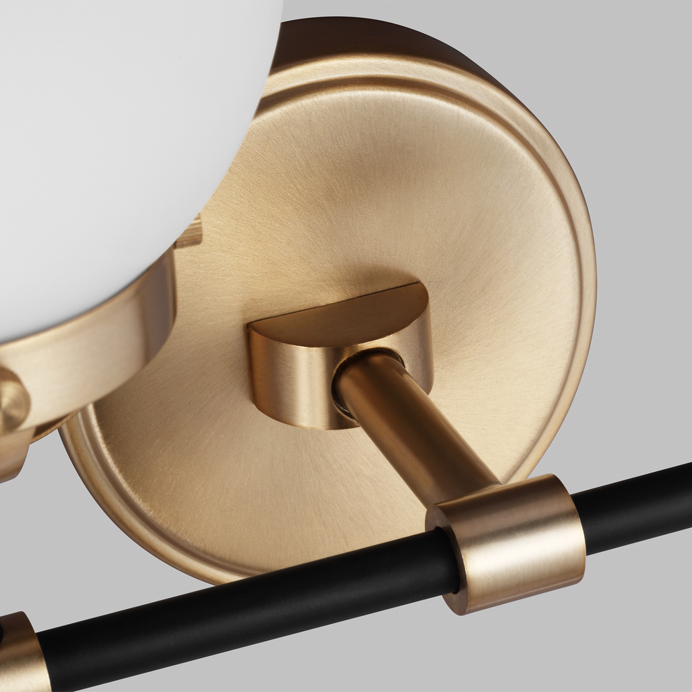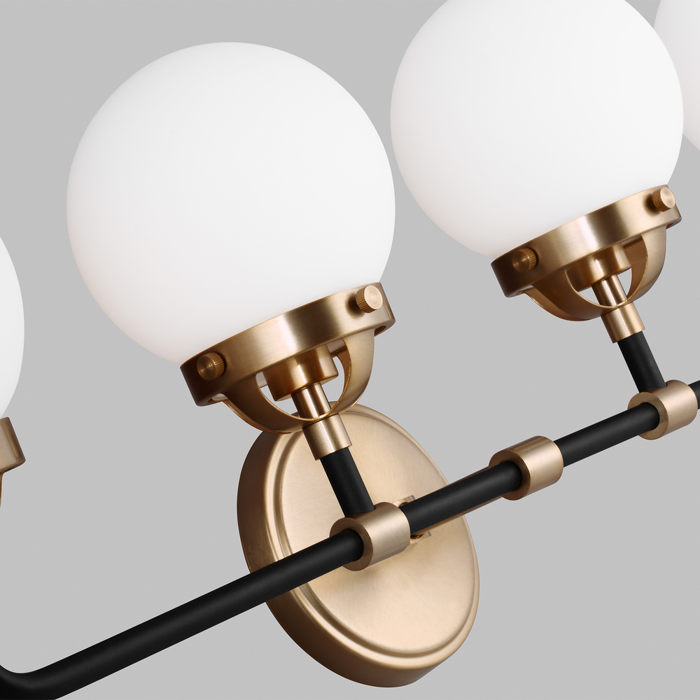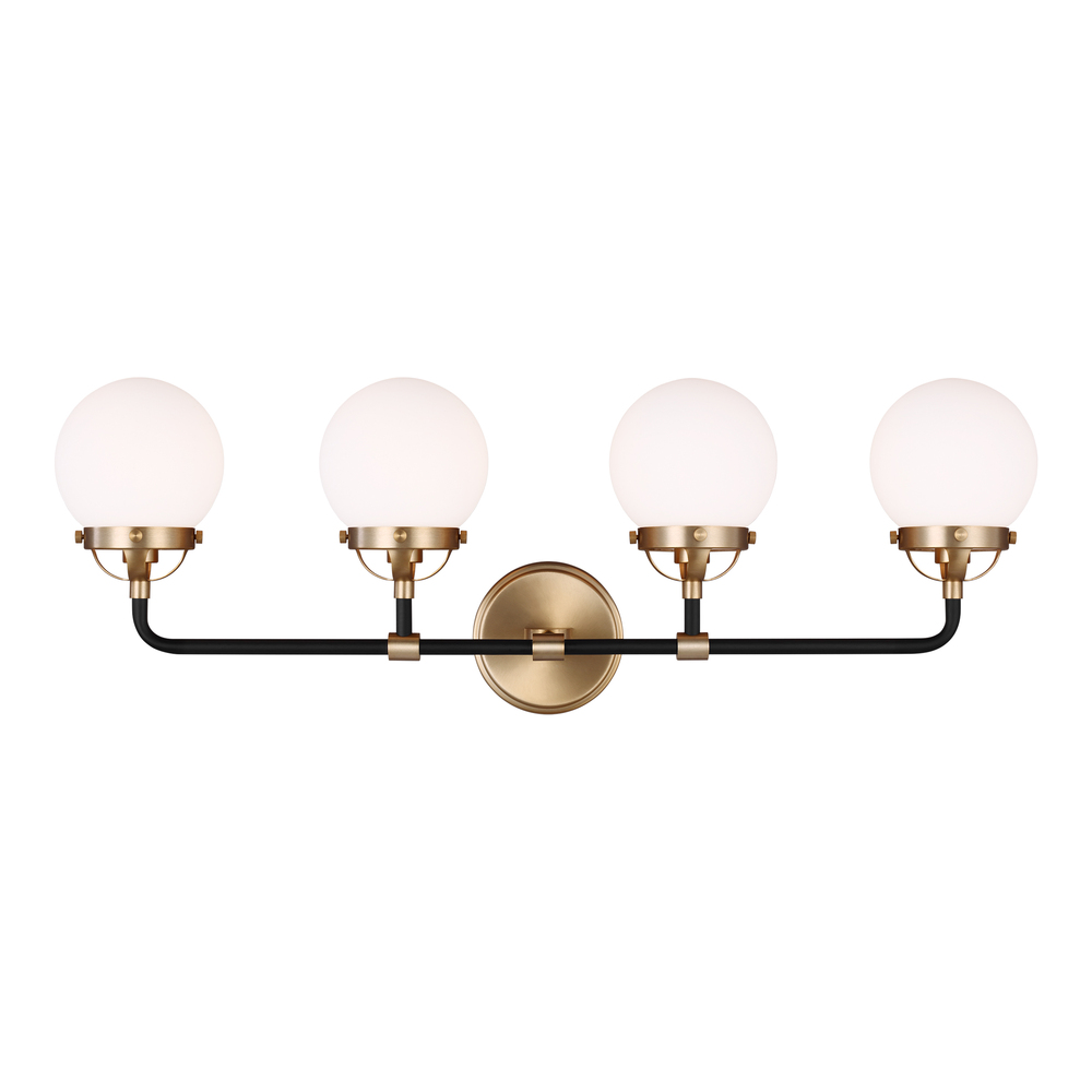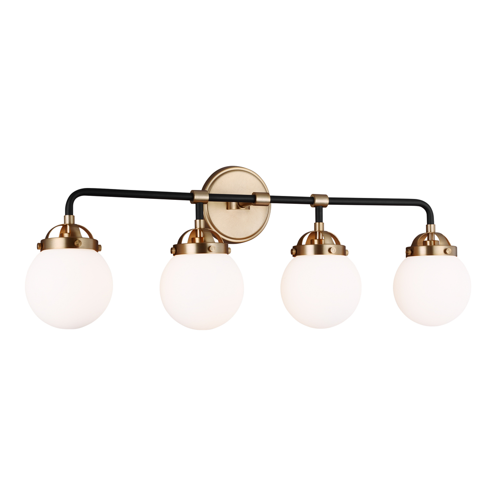 The Cafe four light vanity fixture in satin brass offers shadow-free lighting in your powder room, spa, or master bath room. Â Handsome two-tone finish and white glass globe shades.