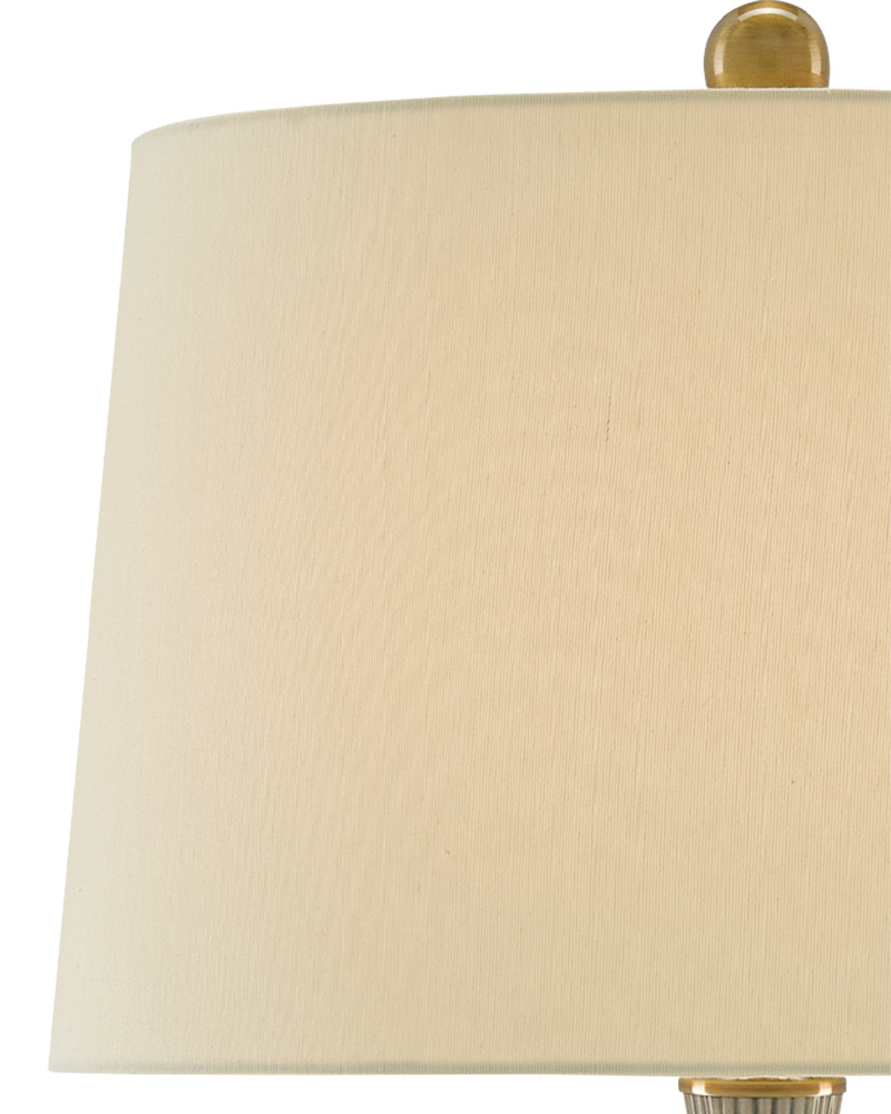 The vase-like body of the Cait Table Lamp is made of striated ceramic in a lovely textural grass green. The paleness of this subtle hue is contrasted by the antique brass finish on the base, the hardware, and the orb-like finial. This green lamp is topped with a tan sand linen shade.