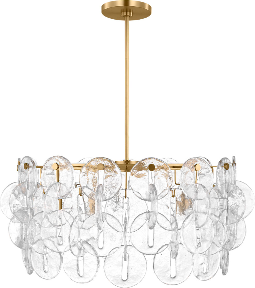 The Candace 27" Chandelier by Kate Spade offers a more compact take on the collection’s signature glasswork. Featuring interlocking textured glass discs arranged in a subtle, sculptural cascade, this profile delivers a layered play of light and form. Its balanced proportions make it perfect for bedrooms, dining areas, entryways, and living rooms, where it adds a decorative statement With clarity and elegance. The 27" chandelier brings a sense of quiet drama and dimensionality to any space.