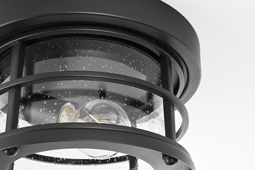 This outdoor flush mount light blends nautical and industrial influences, featuring a rounded frame with horizontal guard rails and a clear seedy glass cylinder for a structured yet functional look. The black-finished iron frame ensures durability, while the textured seedy glass enhances light diffusion, creating a warm, inviting glow. The open-bottom design allows for quick bulb changes, and the flush mount installation makes it a great choice for low-ceiling outdoor spaces such as covered porches, patios, and entryways. Designed for an E26 base bulb (not included), this fixture is also dimmable, offering adjustable brightness levels. ETL Damp Rated, this light is built to withstand moisture and outdoor conditions, making it a reliable and well-structured addition to any exterior setting. Built with marine-grade, corrosion-resistant aluminum, this sconce withstands coastal conditions for long-lasting durability.