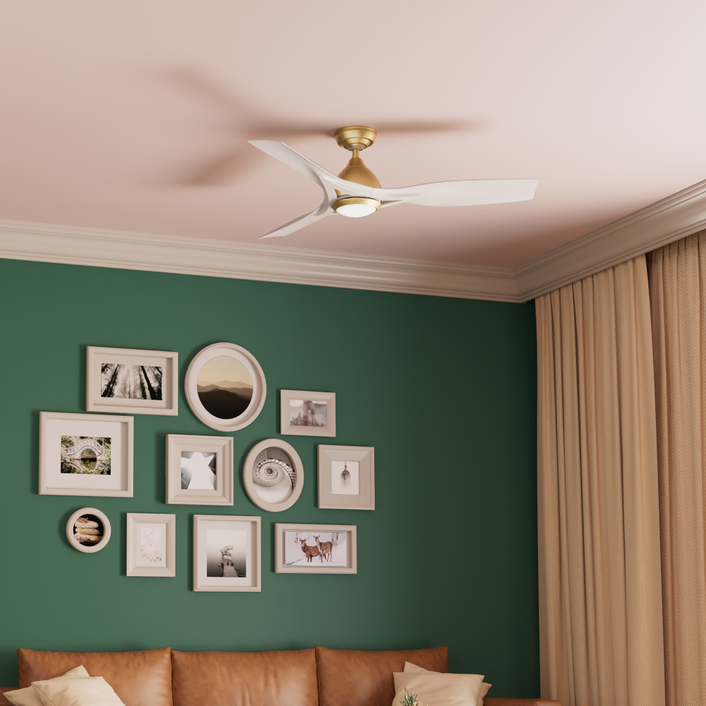 EFFORTLESS CONTROL & DIMMING: Integrated LED lighting with painted cased white glass, paired with a wall control and handheld remote for easy adjustments to fan speed and brightness.
