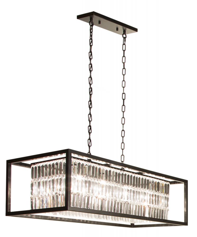 This collection brings the idea of a crystal chandelier into a whole new light. The Catana Collection marries the boldness of oil rubbed bronze with the delicacy of crystals to enhance any décor. It seamlessly brings together traditional, transitional, and contemporary concepts into one brilliant fixture. This rectangular chandelier has suspended, rectangular, faceted glass crystals, housed in a bronze drum cage. Surprisingly neutral and versatile for over a kitchen island or over a dining room table. The rectangular footprint of this piece will complement oval or rectangle dining room tables.