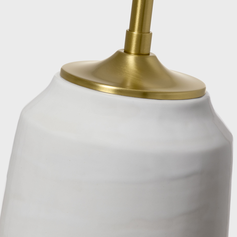 Crafted with Ceramic in a Natural White finish with white linen fabric shade