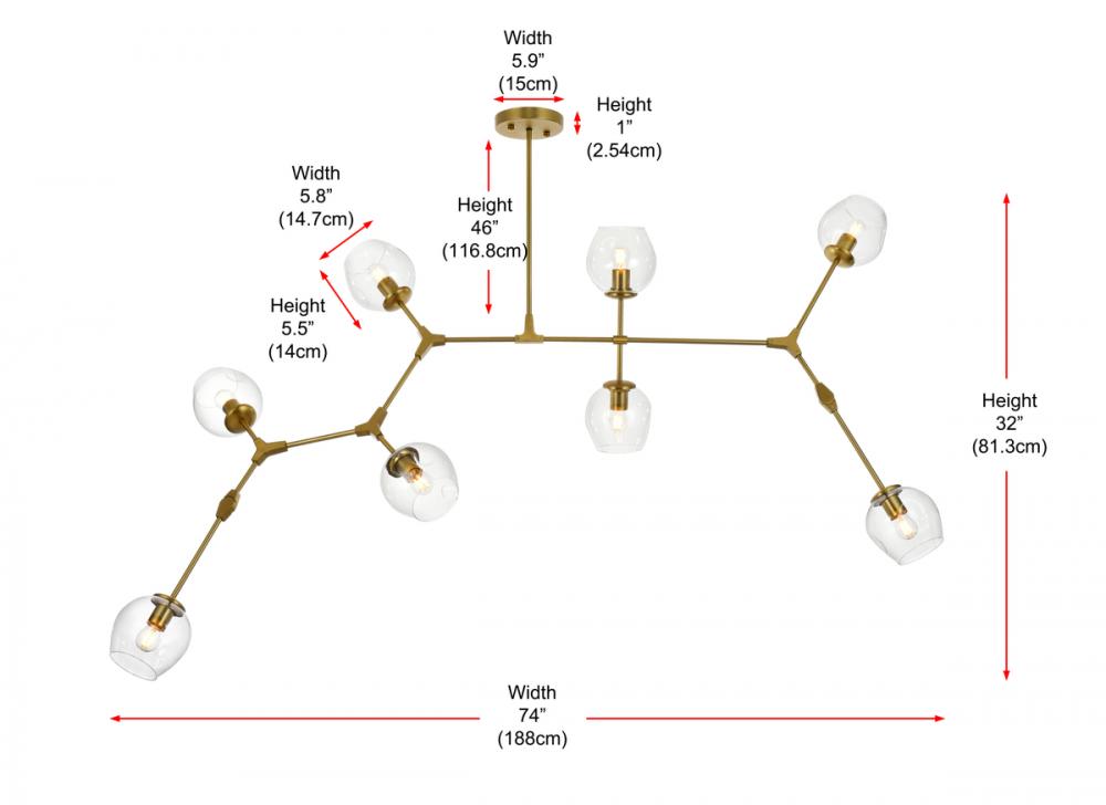 Introducing the Cavoli 74-Inch Chandelier, a perfect fusion of contemporary design and geometric allure. Crafted from durable iron, this visually captivating centerpiece not only adds a sleek modern aesthetic to your space but also ensures a robust and enduring lighting solution. The chandelier holds UL certification, guaranteeing safety and performance adherence. Boasting eight lights with clear glass globe shades, this chandelier offers a stunning visual display, complemented by a dimmable feature for personalized lighting preferences. (Bulbs not included). Illuminate your space with confidence and style.