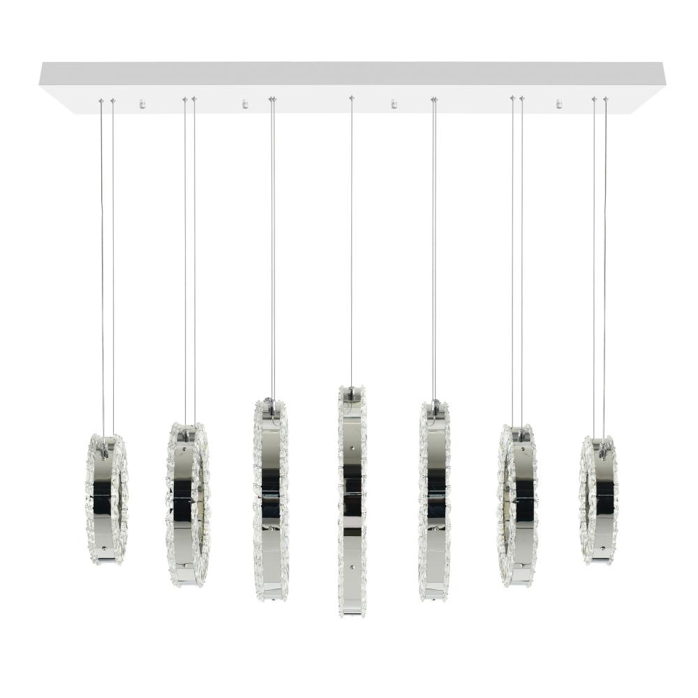 This breathtaking Celina 37'' 7-Ring Modern LED Chandelier with Chrome Finish is a beautiful piece from our Celina Collection. Designed to turn heads, this island chandelier features seven sparkling crystal rings suspended from a sleek 37-inch rectangular chrome canopy. The integrated LED lights radiate through each ring, creating a glamorous glow that enhances contemporary kitchens, dining spaces, or game rooms. Whether hung above a black kitchen island or a billiard table, this showpiece adds instant luxury and dimension to your space. Finish: Chrome Light Count: Integrated LED (7 Crystal Rings) Light Source: LED, No Bulb Required Adjustable Hanging Height: Yes Material: Metal and Crystal Style: Modern / Contemporary