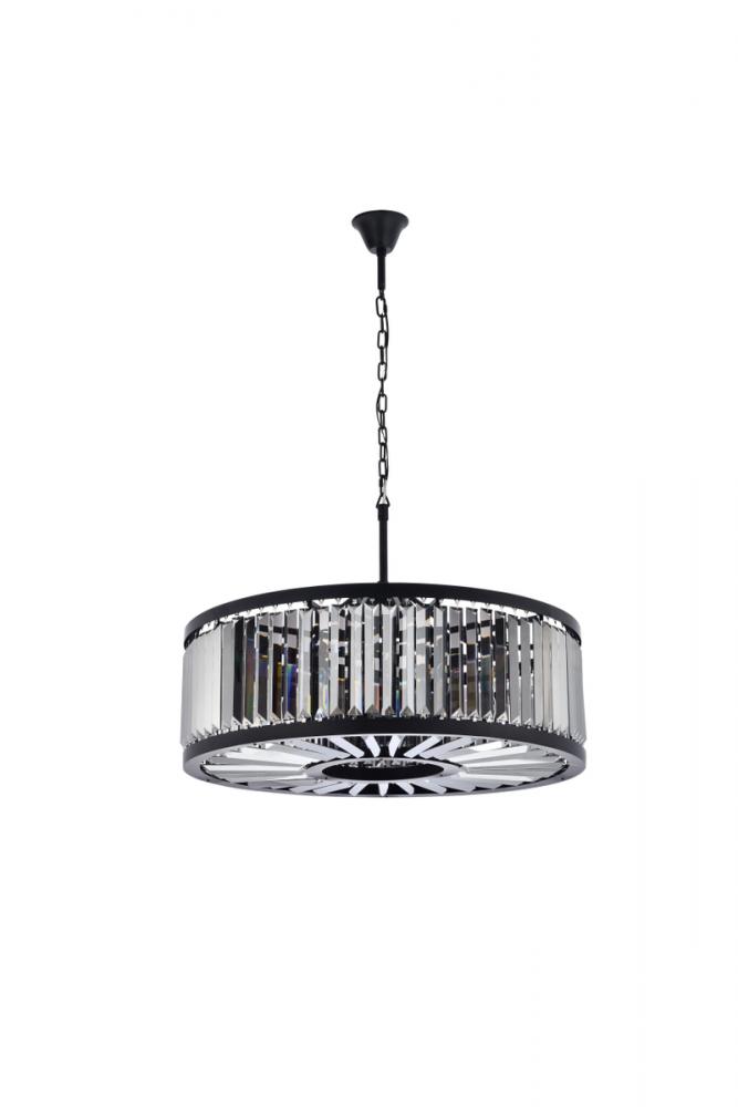 Lamp features a diameter of 35.5 inches, a height of 15.5 inches, a minimum hanging length of 22 inches, a maximum hanging length of 75.5 inches, and requires 10 candelabra bulbs