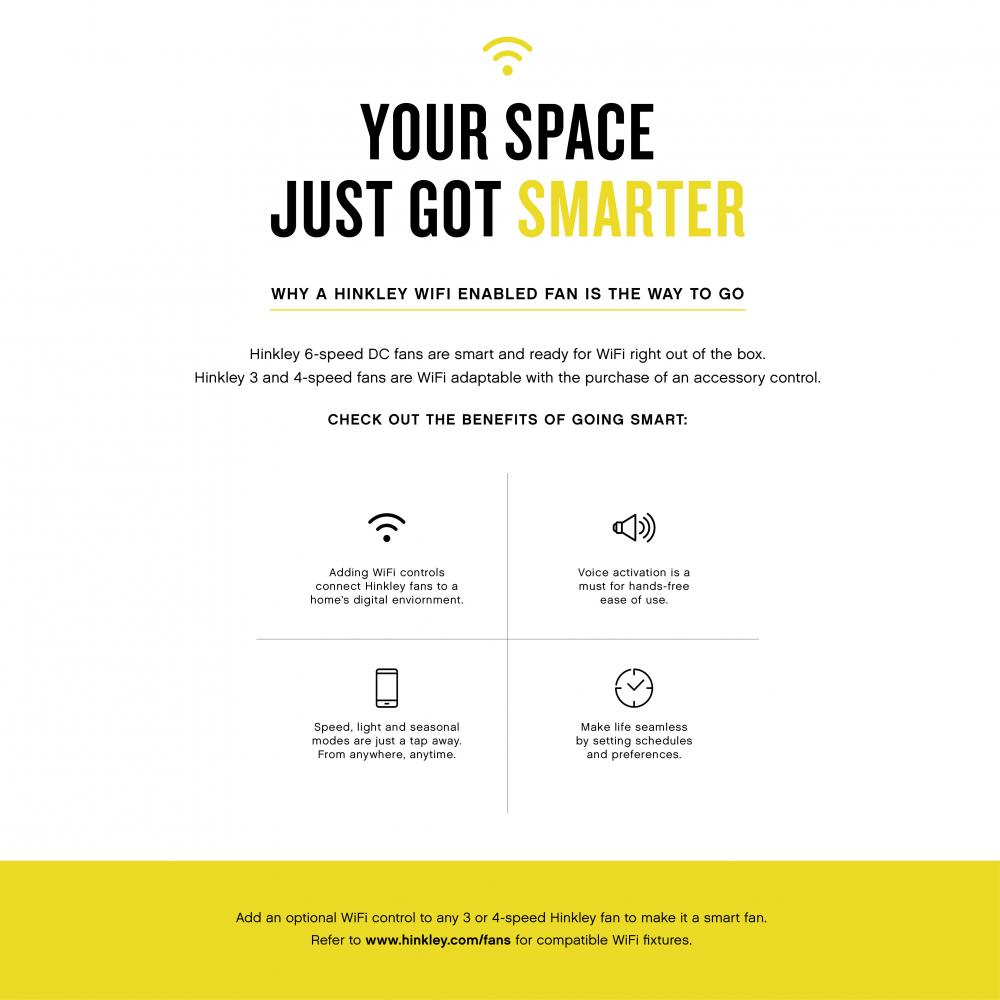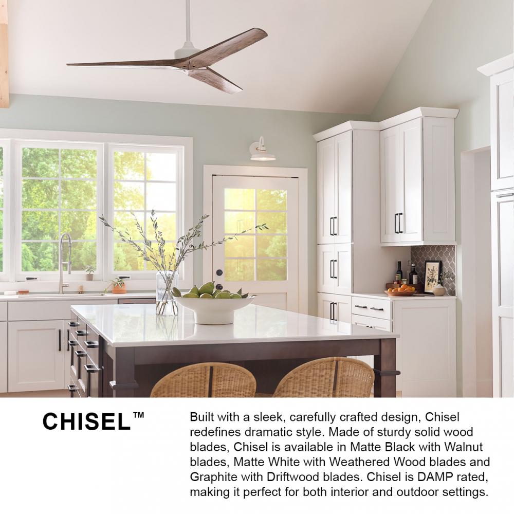 Built with a sleek, carefully crafted design, Chisel redefines dramatic style. Sturdy solid wood blades are available in a variety of sophisticated finishes to complement modern interiors and outdoor settings. Damp rated. Equipped with a 6-speed DC motor that is WiFi enabled and ready to connect right out of the box. Operated by the HIRO control or WiFi compatible with the Hinkley App.