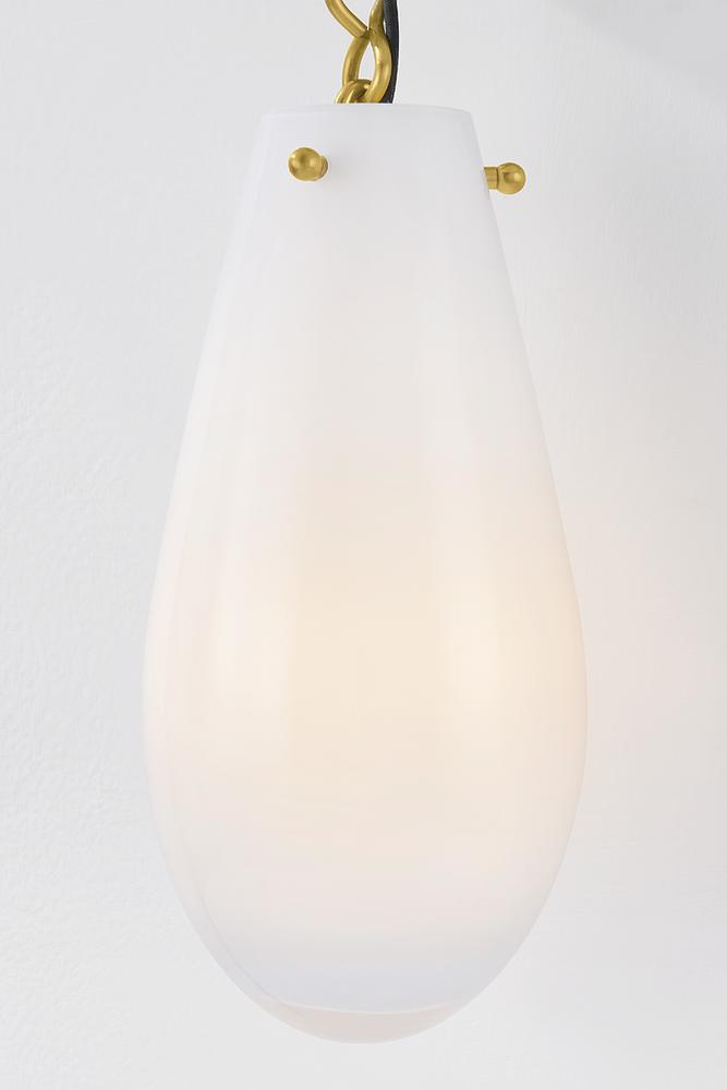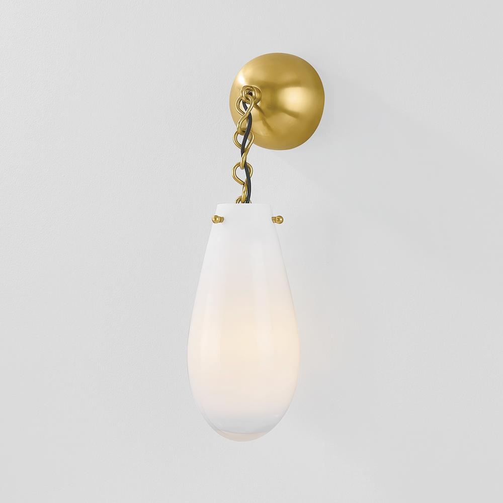 Reminiscent of a drop earring, the layered glass shade of Clarkstown hangs from a dainty circular looped chain. The domed, unadorned canopy allows the special quality of the chain and glass to shine. Decorative pins enhance the jewelry-like quality of this sconce.